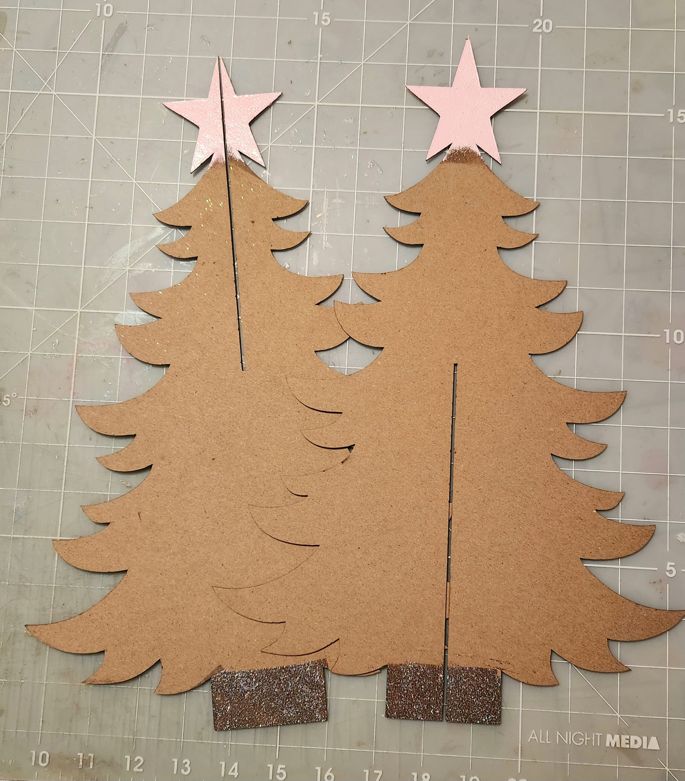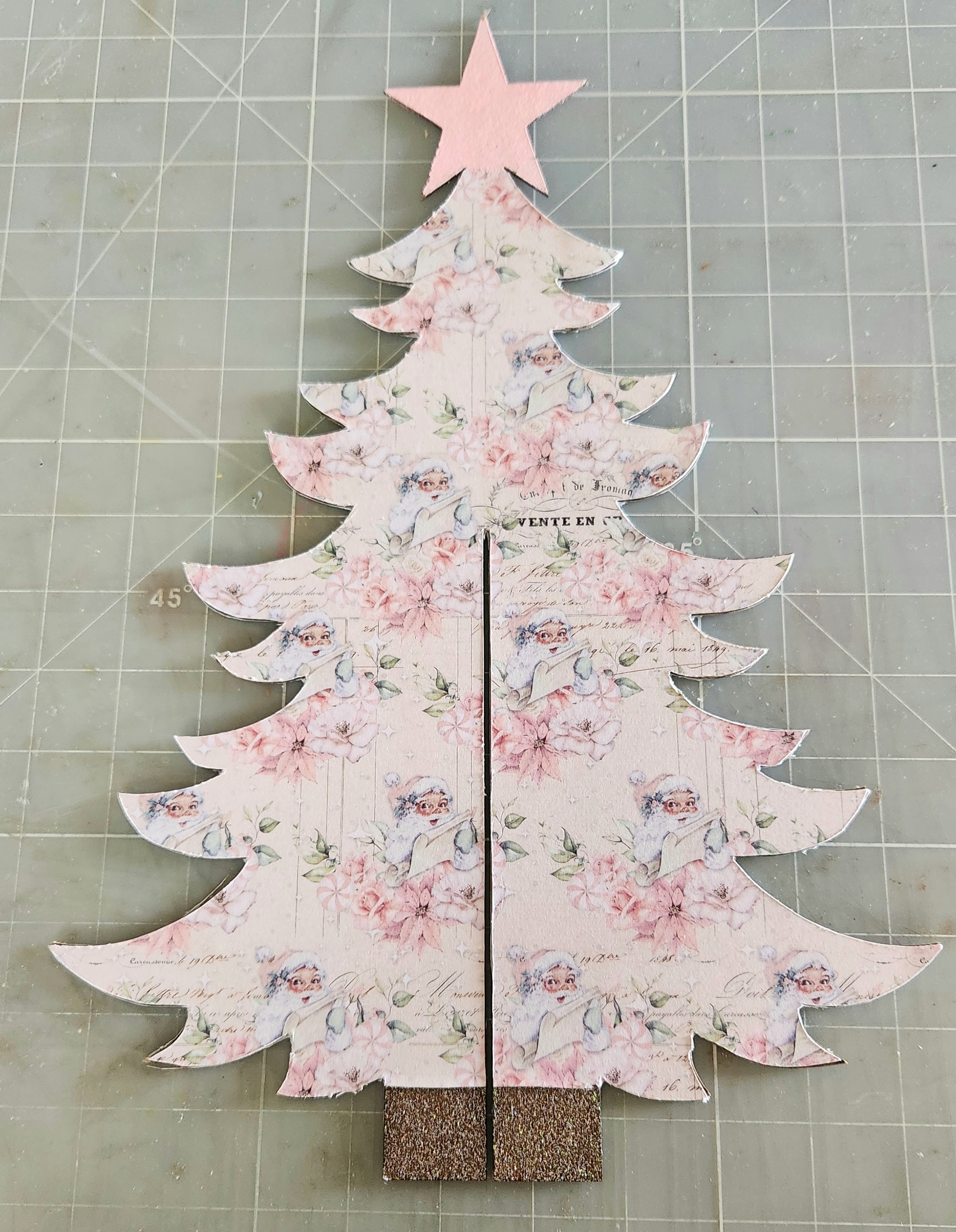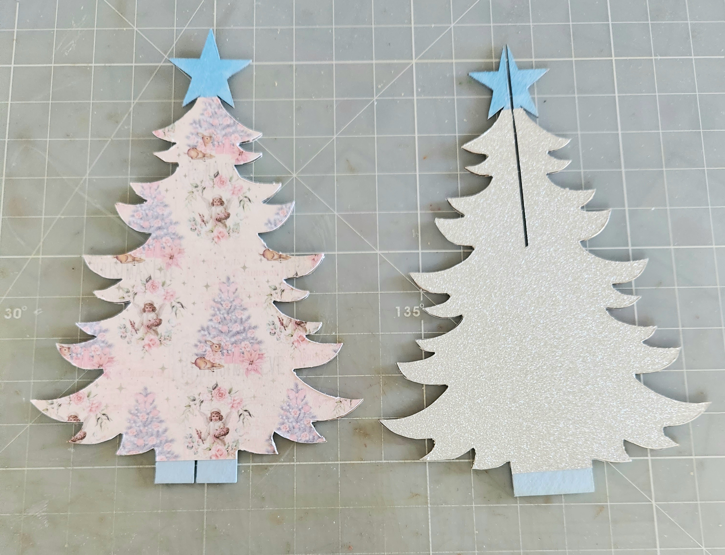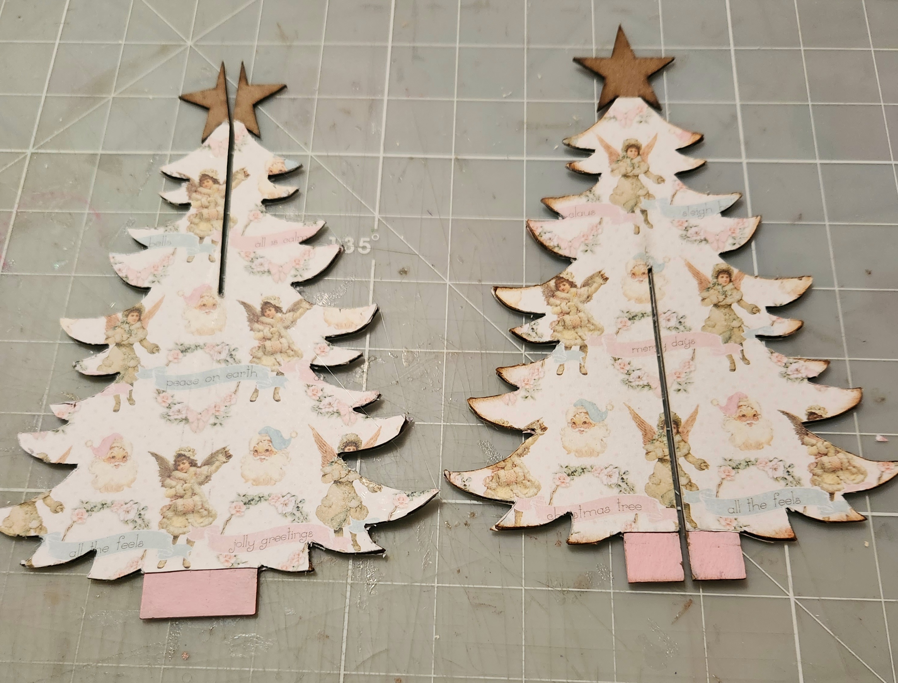 Next trace coordinating patterned papers to all sides of your tree. Trim away any excess paper using a x-acto knife. Then using my Distress tool, I smoothed any rough edges. Repeat this process for each tree. Be sure to cut the slot in the middle of each tree.