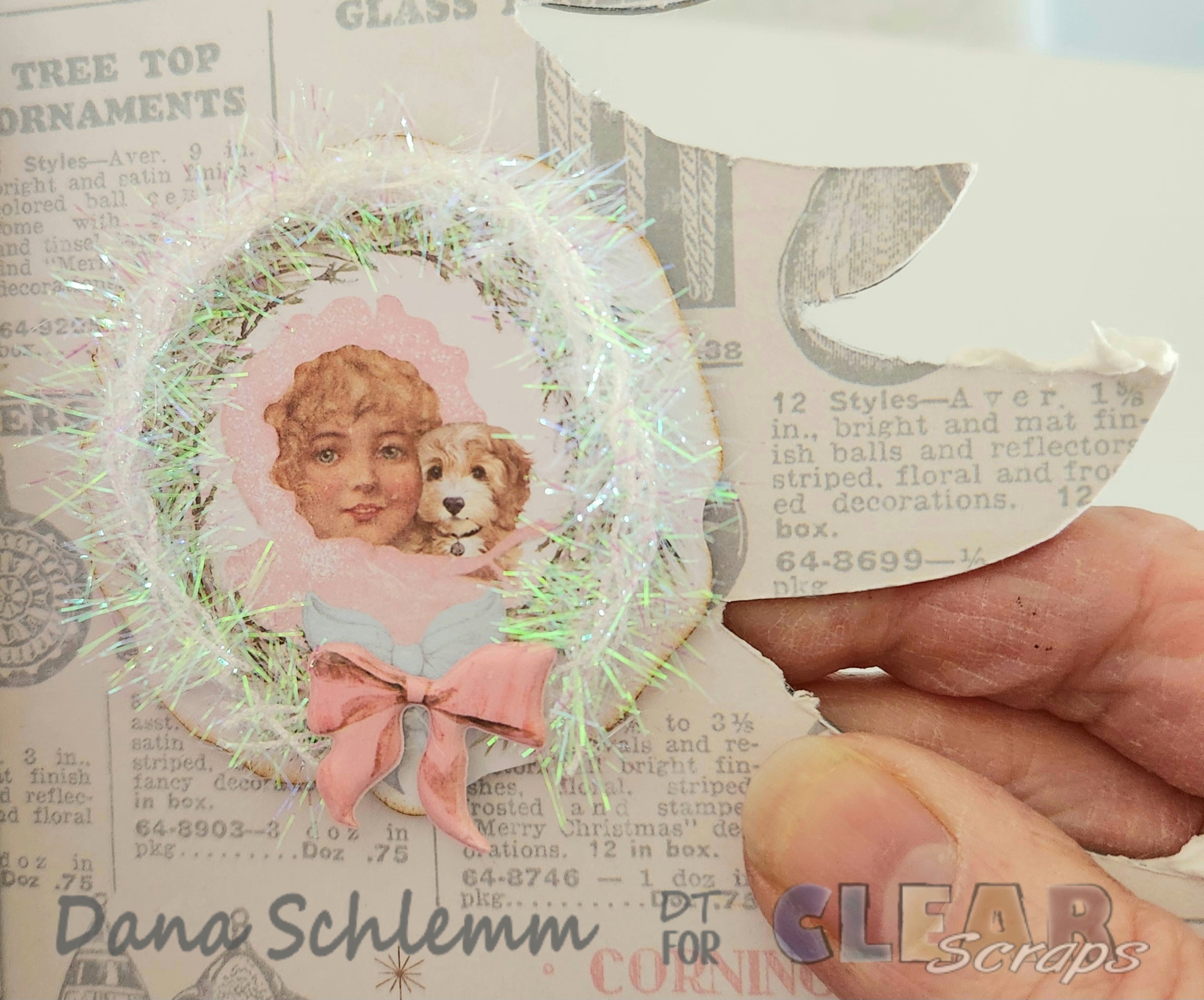 Large Tree: I glued a variety of ephemera, chipboard stickers/and hearts and sentiments. For the chipboard wreath with the little girl and puppy, I glued some Sparkle tinsel around the outside edge of my wreath. This adds some Sparkle! Here's some closeups!