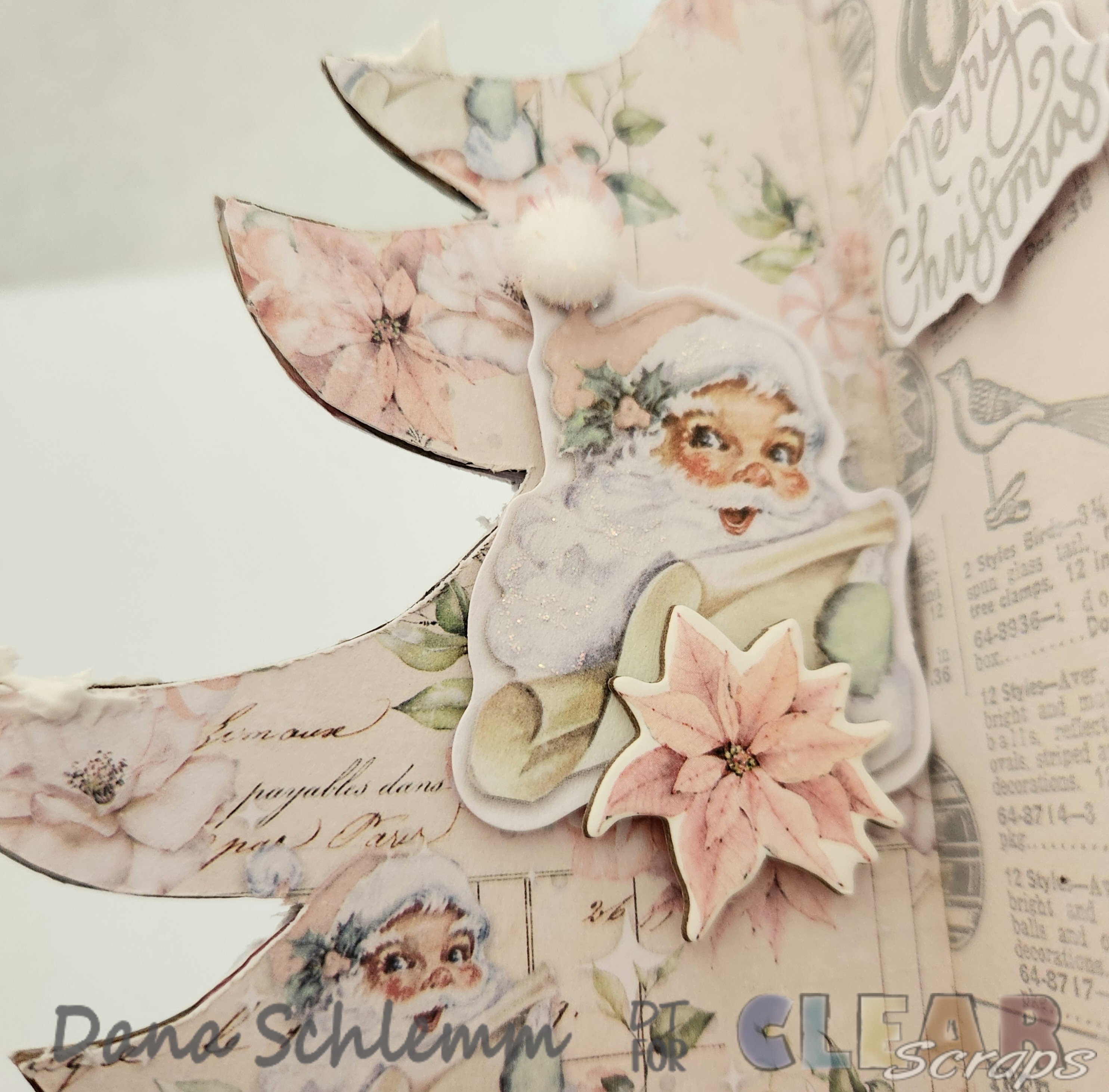 Now we can start decorating our 3D Christmas trees! This is my favorite part! I love to use different embellishments such as glitter, flowers chipboard stickers and more. Just decorate to match your own style. I wanted a more Shabby vintage look to my trees. But you could create with traditional Christmas colors if you desire.