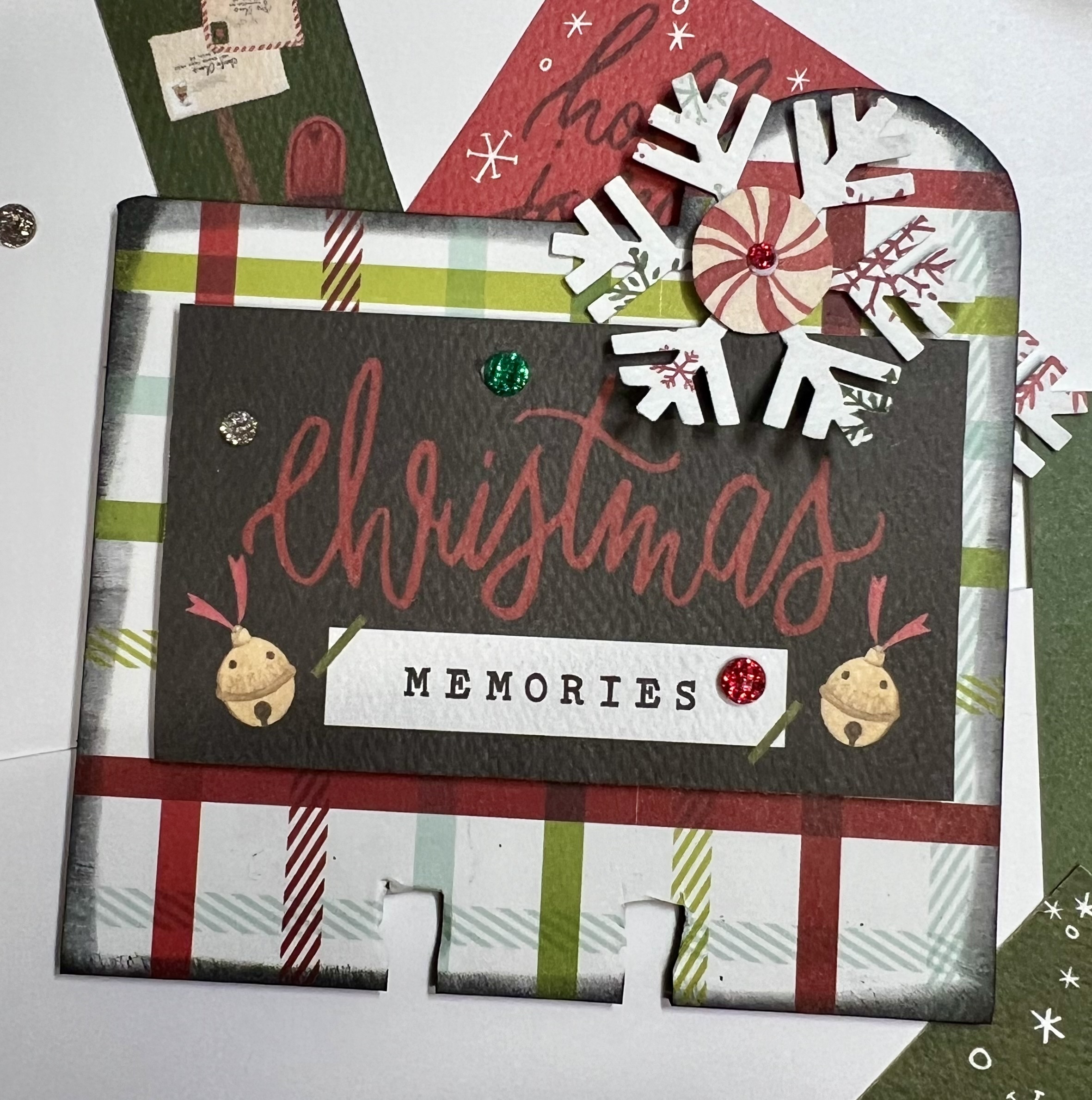 The second divider is for highlighting all the fun Christmas memories to scrap. Using a snowflake punch and fussy cut for the peppermint center. In the center is a glitter drop. I edged each divider in black ink. You can easily add in a journaling card for capturing the holiday memories and add in your favorite pictures will be so easy with the memory dex system.