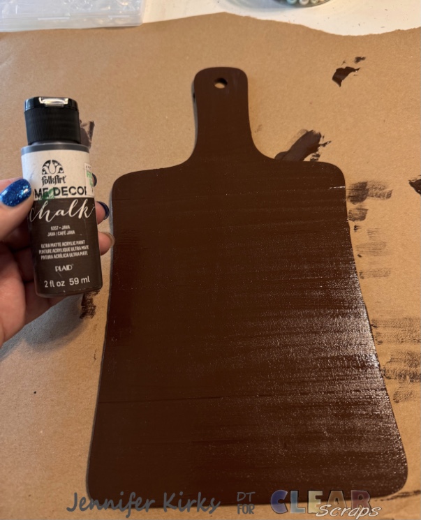 First thing I did was to paint the cutting board with brown chalk paint. Chalk paint provides a thicker coverage so you don’t have to add several layers. After the paint dried I grabbed the top portion of the heart stencil and some medium crackle paste and applied it to the center of the cutting board.