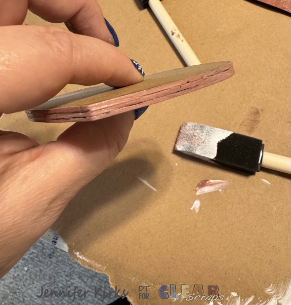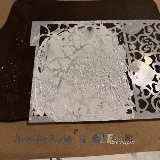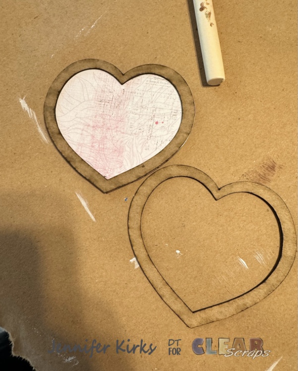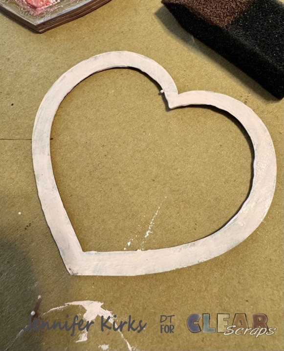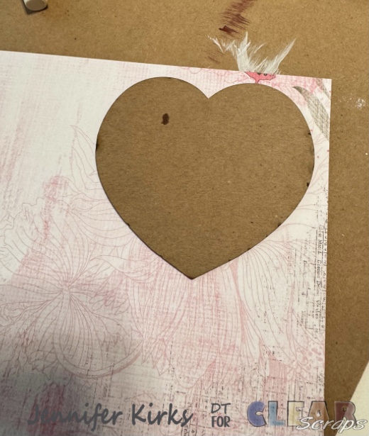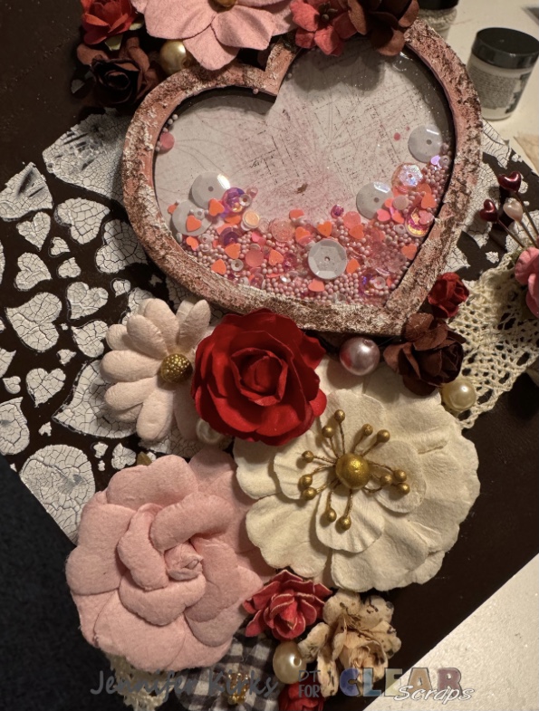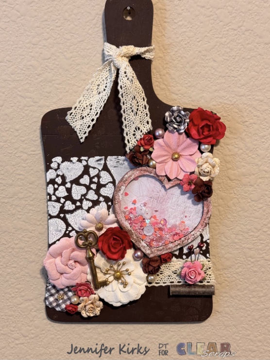 While the paste was drying I grabbed the heart shaker, some paper and traced, cut and glued the paper to the bottom portion of the heart shaker. I glued 2 of the heart shaker layers to the bottom portion and filled it with misc bling, gems and beads. I then removed the film from the acrylic portion and glued it to the shaker. Finally I painted the top Layer of the shaker with pink paint, followed by crackle paste and then I dabbed some brown paint on top. Once dried I glued it to the top of the acrylic. I added some paint around the edge so it will blend better with the cutting board.