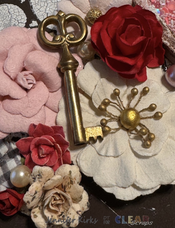 I glued the shaker to the middle of the cutting board and then I gathered flowers, beads, decorative pins, lace and a gold key and layered them on the board in a diagonal pattern. I tied some lace to the top portion to finish it off.