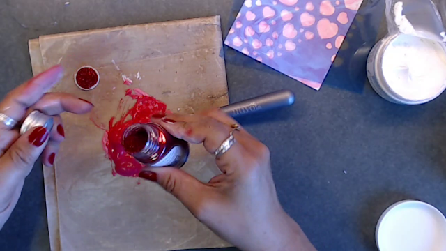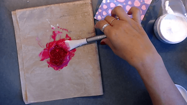 Next we are going to use one of the card panels with the Heart Arrow Stencil. So I grabbed some red paint and red glitter with some mixed media white paste and mixed everything together.