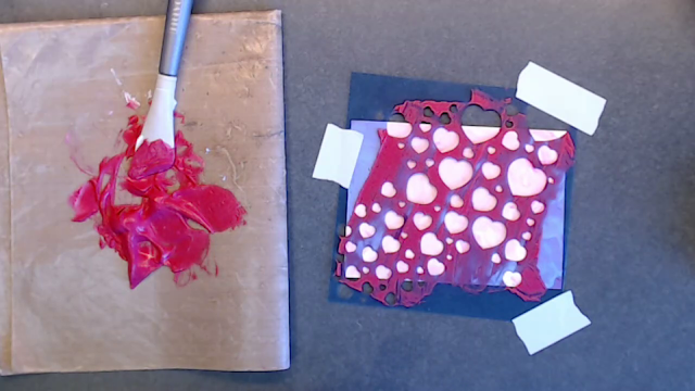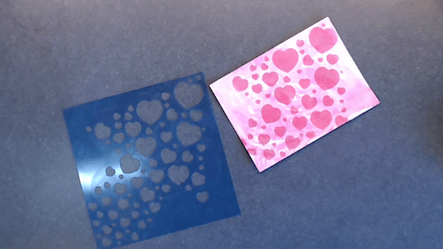 Next I tapped down the stencil on top of the card so I wouldn't have any movement. However, the card slipped a bit so I did have a few hearts that didn't turn out.