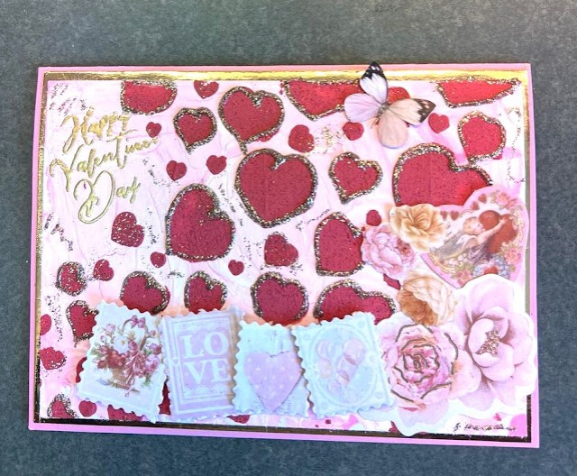 Here is the finished card. I added some stickels around the hearts and a little stickels here and there around the card. I used some ephemera and did some fussy cutting from the paper collection I used, added a pink butterfly. I also heart embossed a sentiment in the left hand corner.