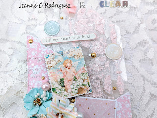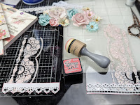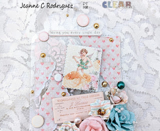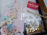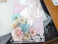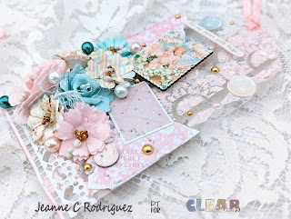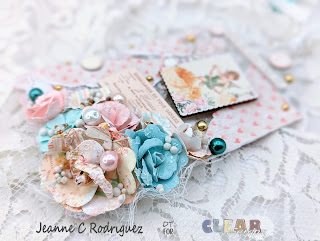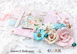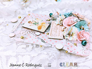 Once I put the flowers where I wanted them, I first adhered some pieces of white cheese cloth and the flowers using Fabri Tac. This holds the flowers in place much faster than a white liquid glue (at least this what works with me on acrylic). I began embellishing using the Wooden Stickers, Puff Stickers and Ephemera from the With Love collection. I used some Pink Fresh Metallic Gold Dots adhering them throughout the tags. I also added soft pink, white and mint colored pearls which actually look like teal colored in my photos.
