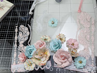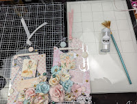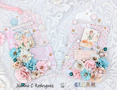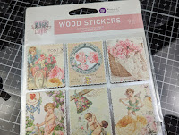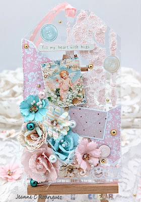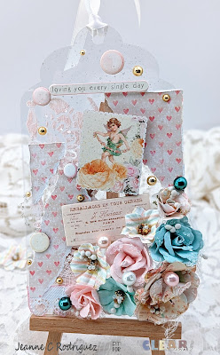 Note: I did also use foam tape and foam tape on some of the flowers as well as the wooden stickers, for added dimension. Lastly using the Finnabair Vintage Roses Mica Powder (white), I mixed it with water and using a splatter brush, I made some splatters on the tags. I love how it looks once dry.