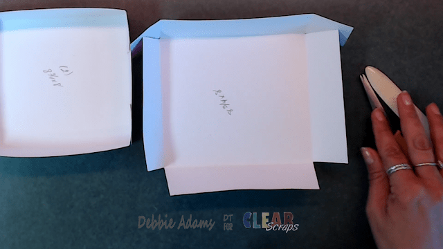 After scoring both pieces of card stock cut the score lines as shown below. Once you cut the card stock now you have tabs put only one sheet together to form your box.