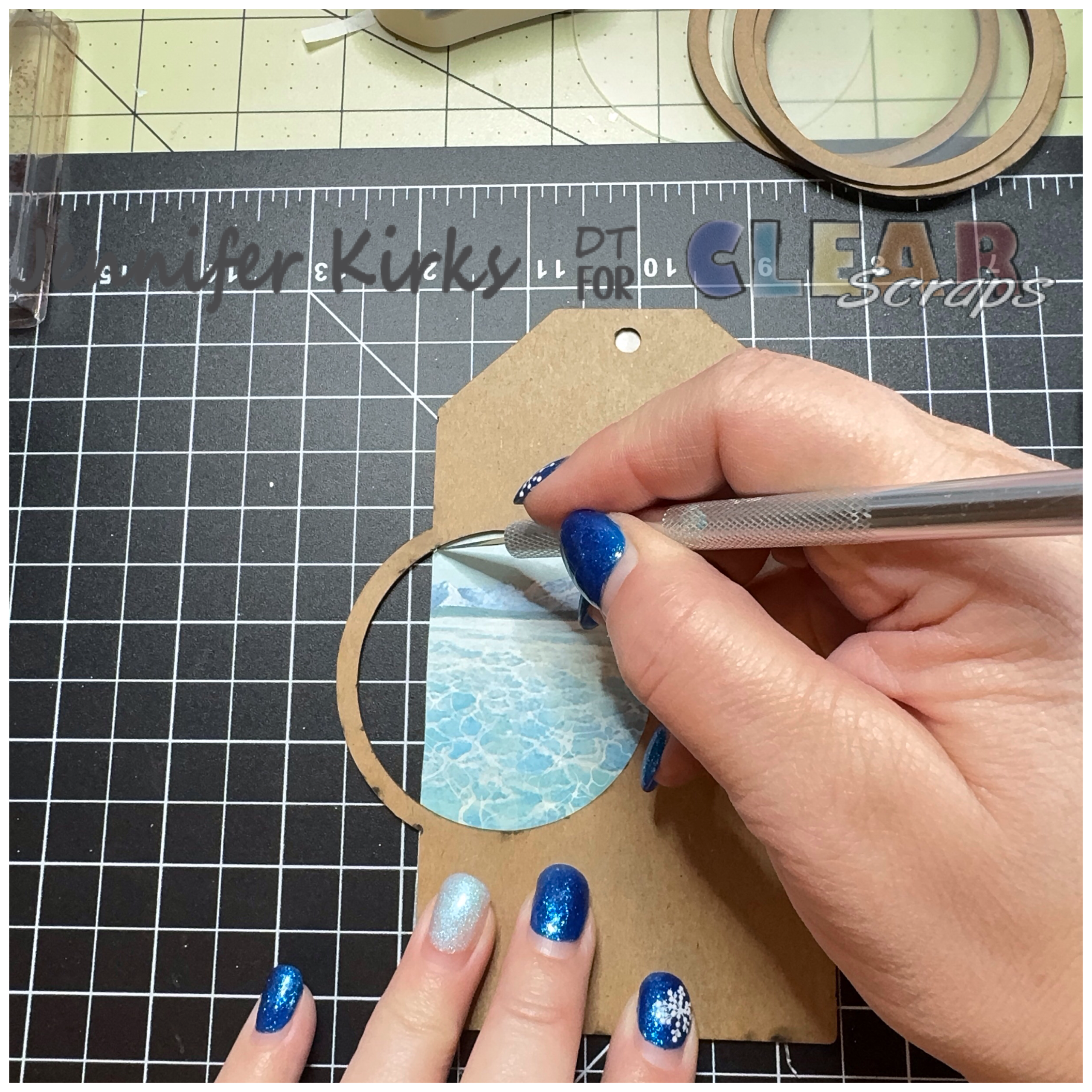 Trace and cut out 2 pieces of paper for the front and back of the tag. Ink and glue the first side. Using an exacto knife, cut the paper out of the center of the circle. Repeat for the other side.