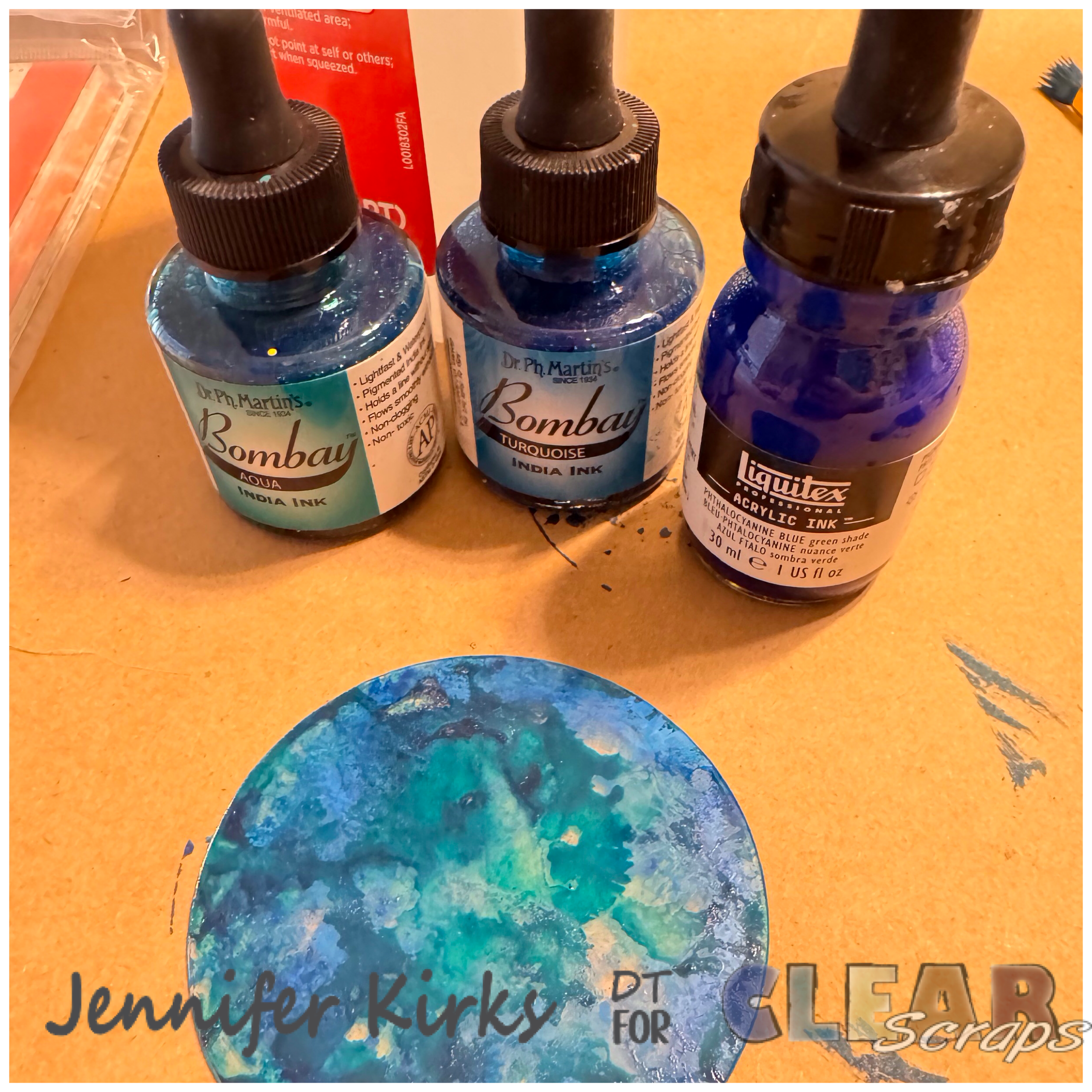 While the chipboard circles are drying, grab 1 acrylic circle and remove the film from both side. Using alcohol inks or India ink (which is what I used), “color” the acrylic circle. I added a few drops of India ink, spread it around and added some drops of alcohol to get the “water” effect.