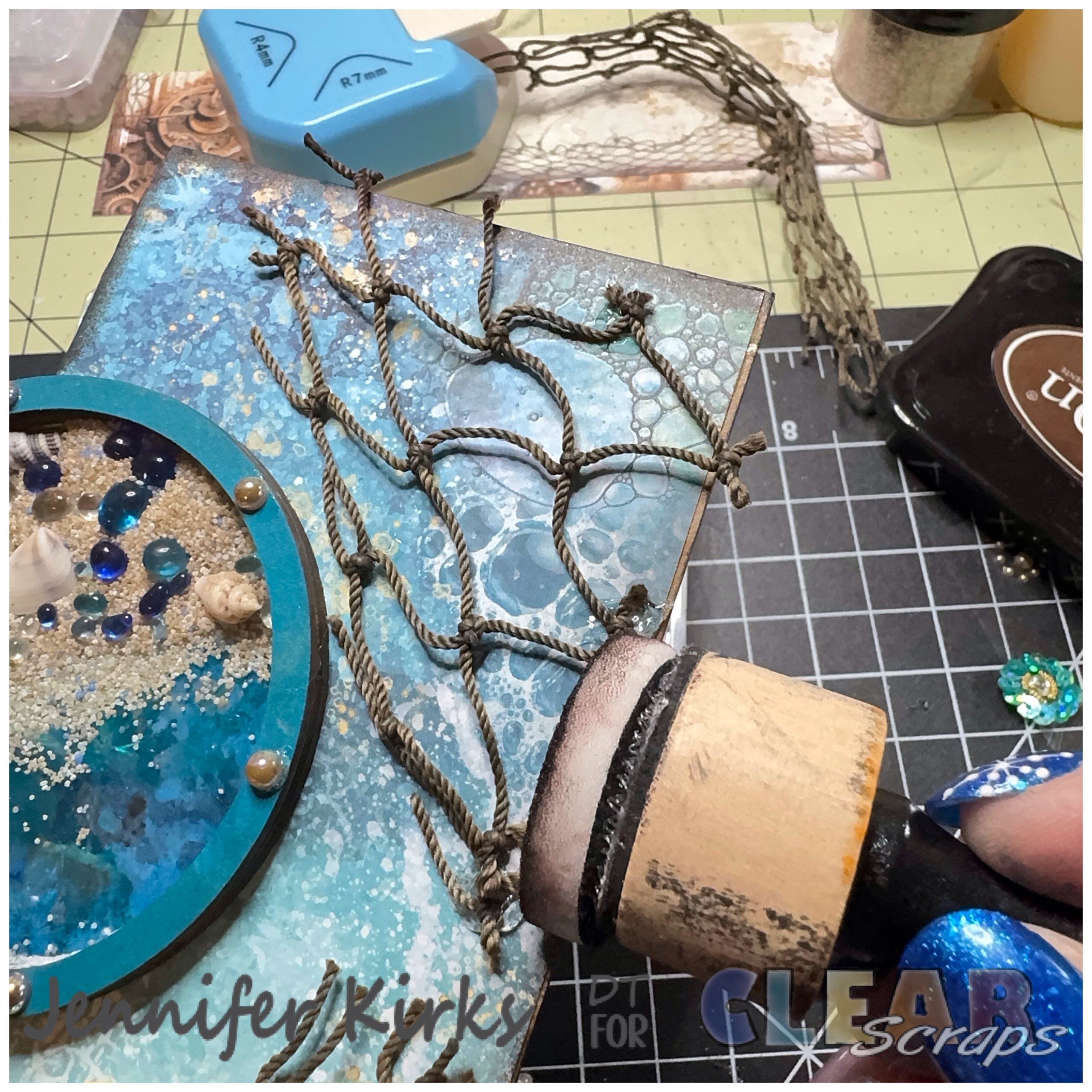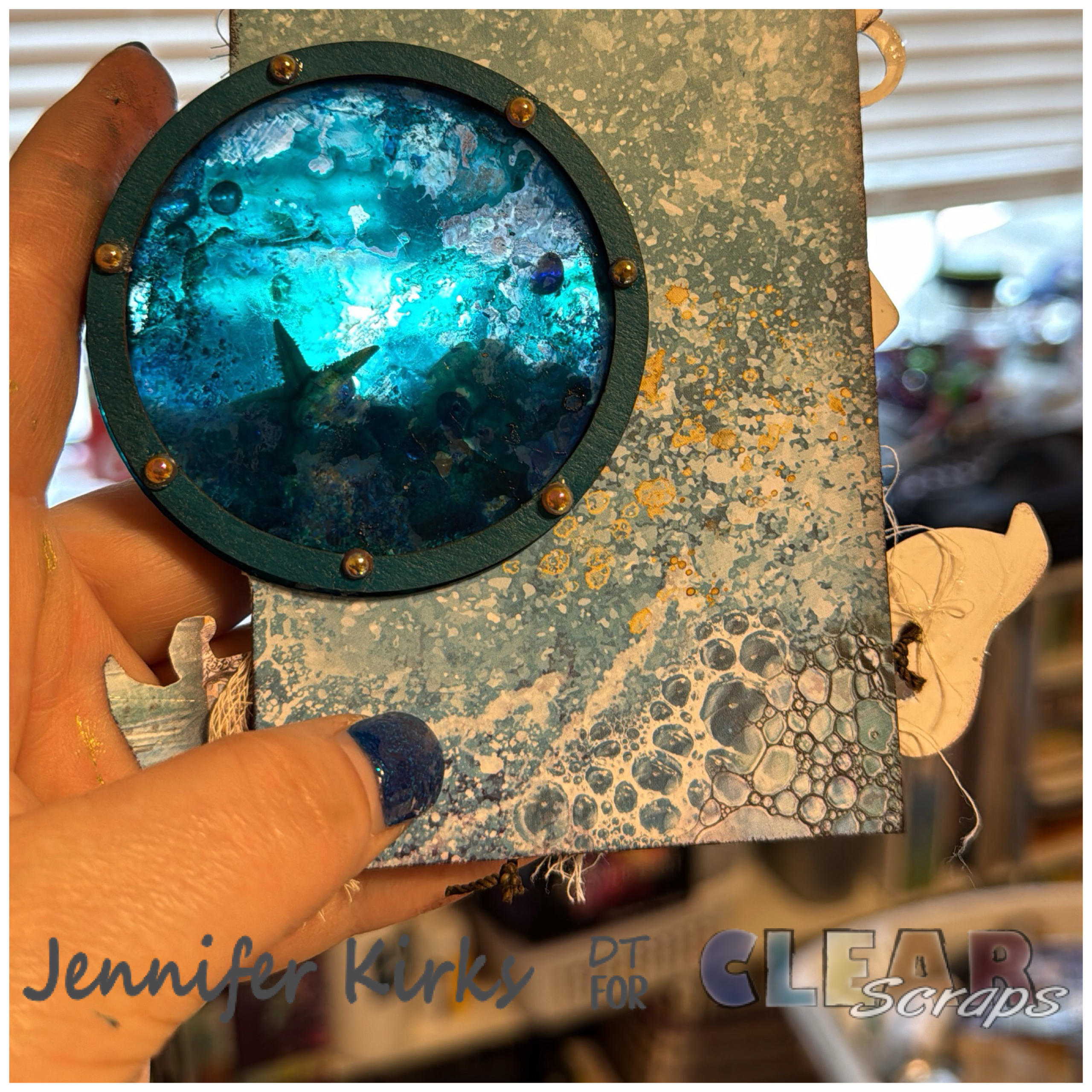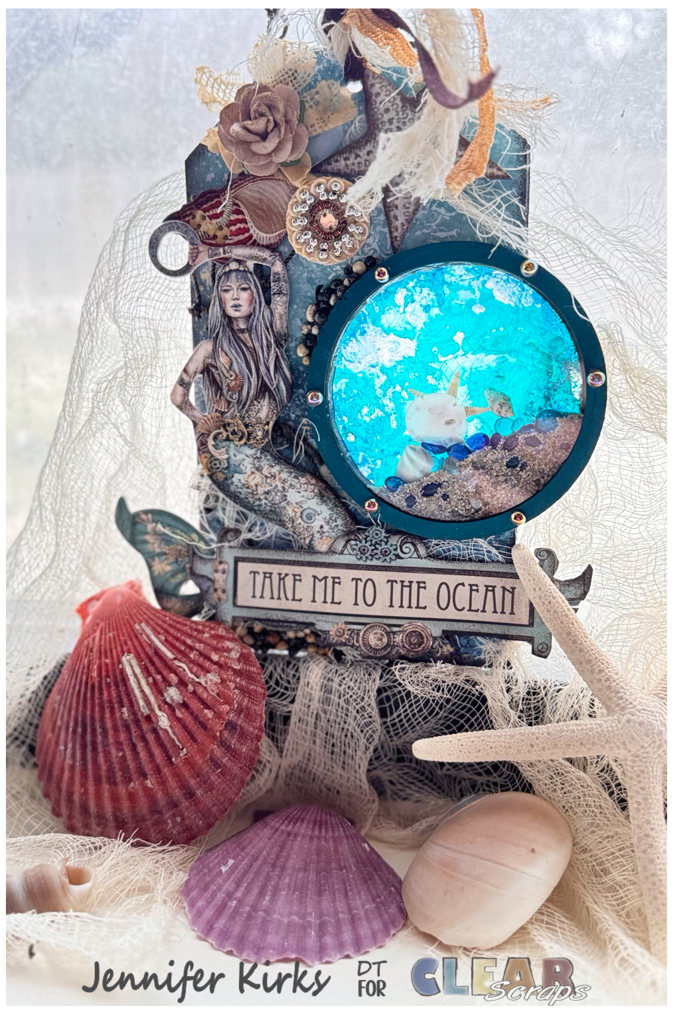 I added some ribbon mixed with cheesecloth to the top of the tag. I love how the shaker looks like water. The brown and blue colors with a hint of pink and purple are so pretty. These shakers look great in a junk journal, album or just for display. I hope you have been inspired to grab a few and explore.