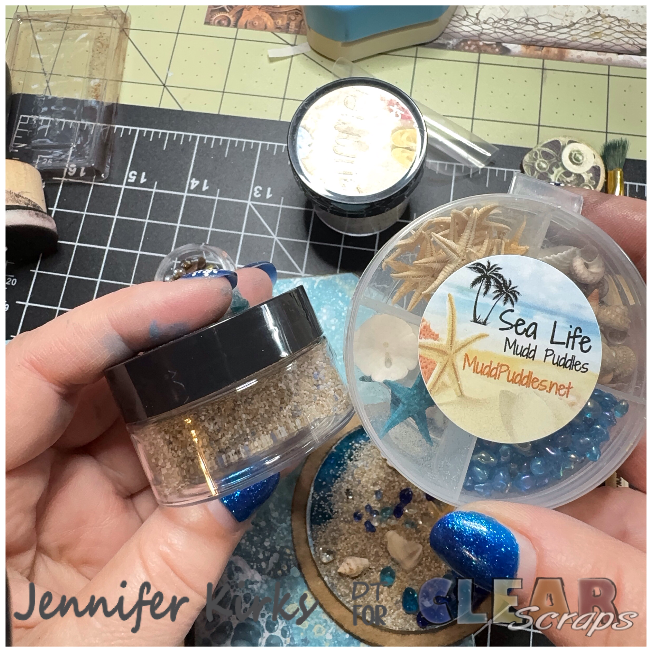 I then grabbed 2 more chipboard circles and added them to the front of the tag. Using sand, shells, and sea glass, I filled in the shaker. Then I removed the film from the other acrylic circle and glued it to the top of the chipboard circle (you should have 1 chipboard circle left). Then I glued the last chipboard circle on top of the acrylic circle and added more brown/brass cabochons.