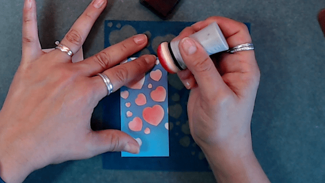 Next I cut to white pieces of cardstock measured 1 7/8 x 3 7/8 inches and stenciled the hearts from the Heart Arrow stencil from Clear Scraps.