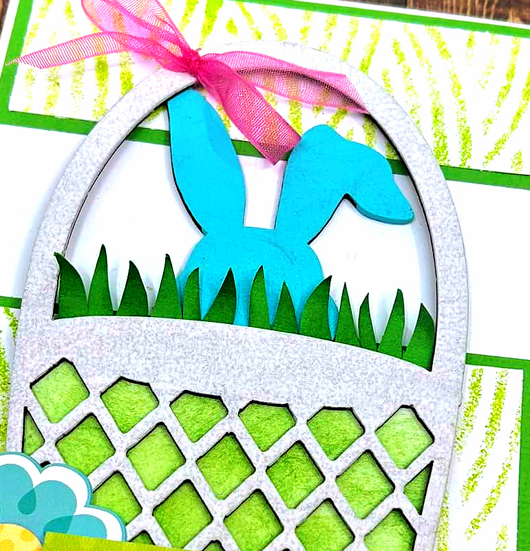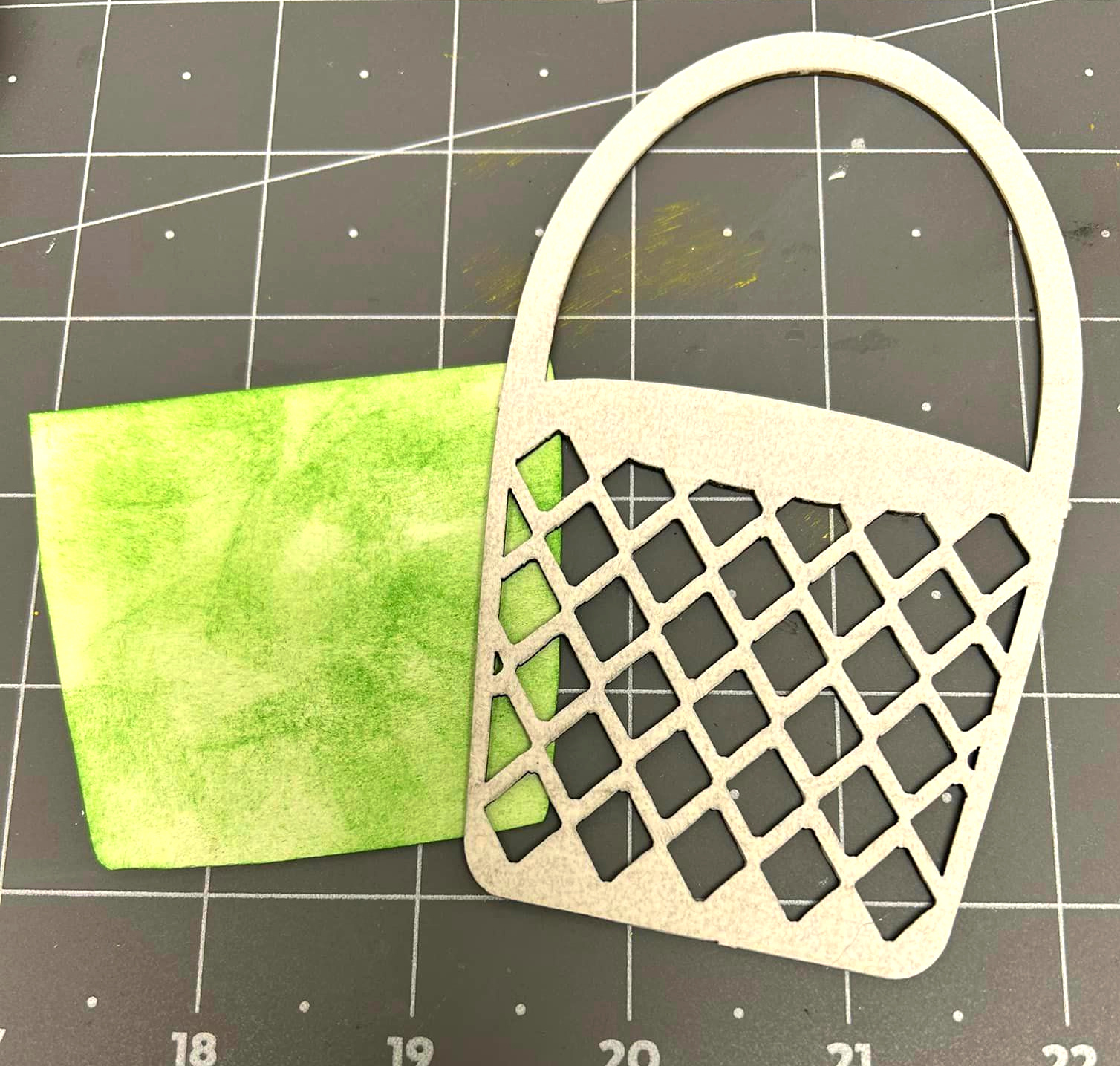 This piece was brushed with green ink. I wanted to leave it soft and a little wispy looking to be a bit like grass. This piece was glued to the back of the basket. I also cut a small piece of green cardstock like little blades of grass and glued along the top edge. You can use a die or paper punch, etc to create that look, or do this by hand (since it's a small piece).