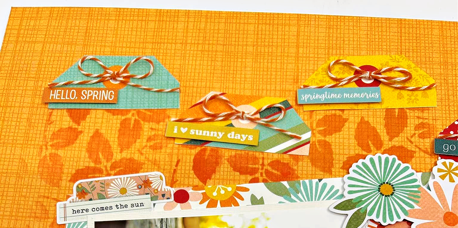 I used cut out tag toppers at the top of each stenciled section. A few sticker sayings and twine bows make a cute addition.