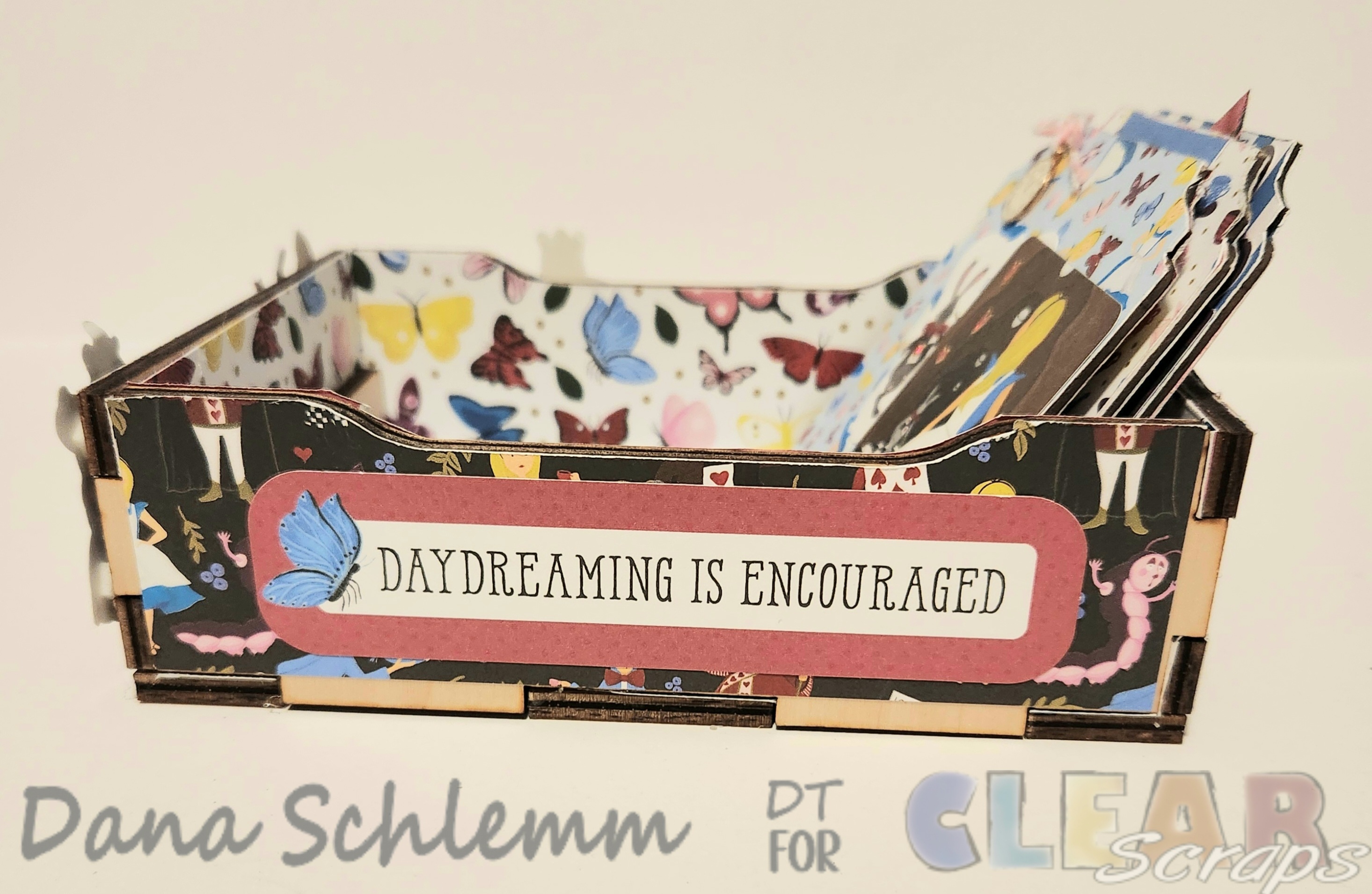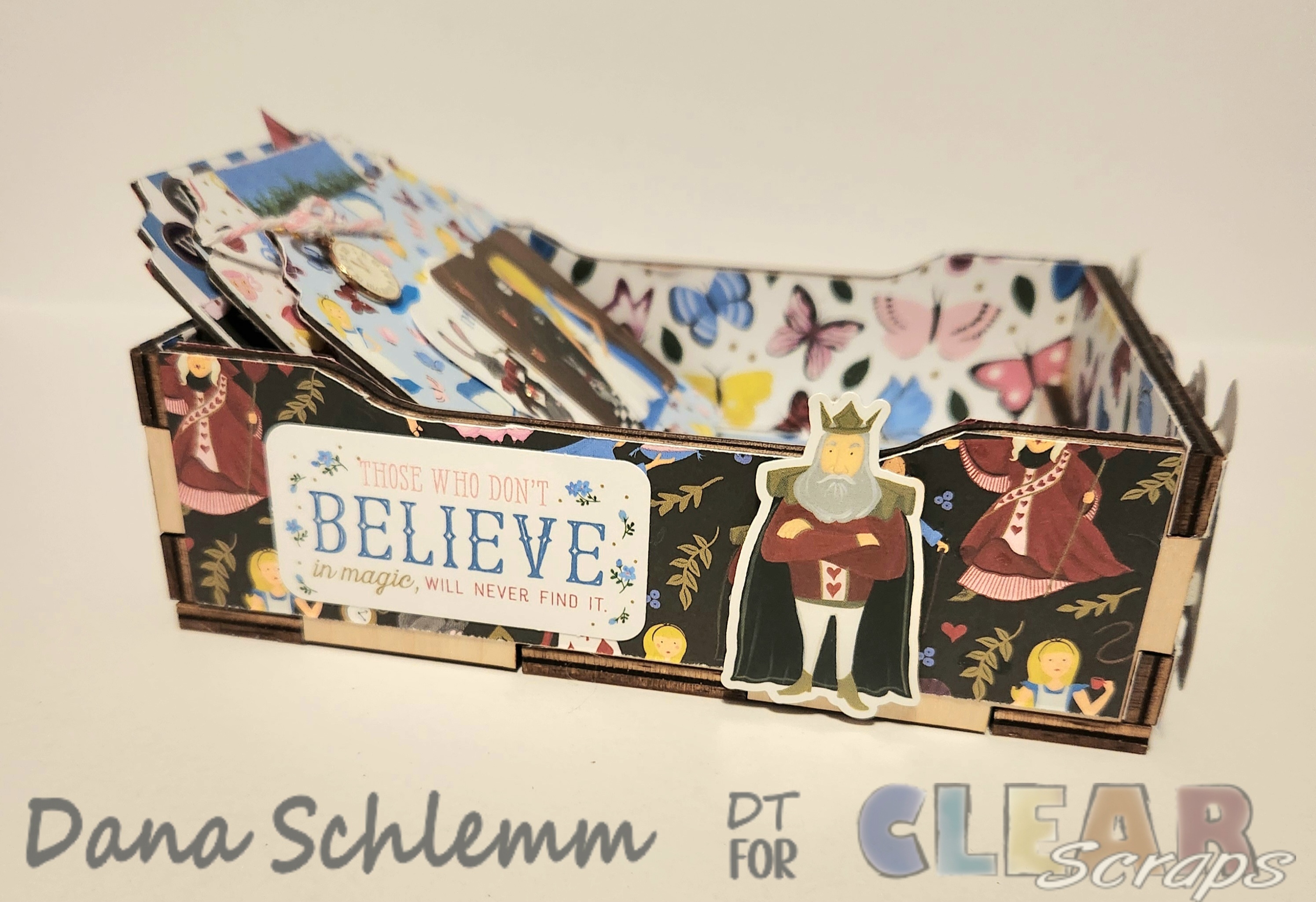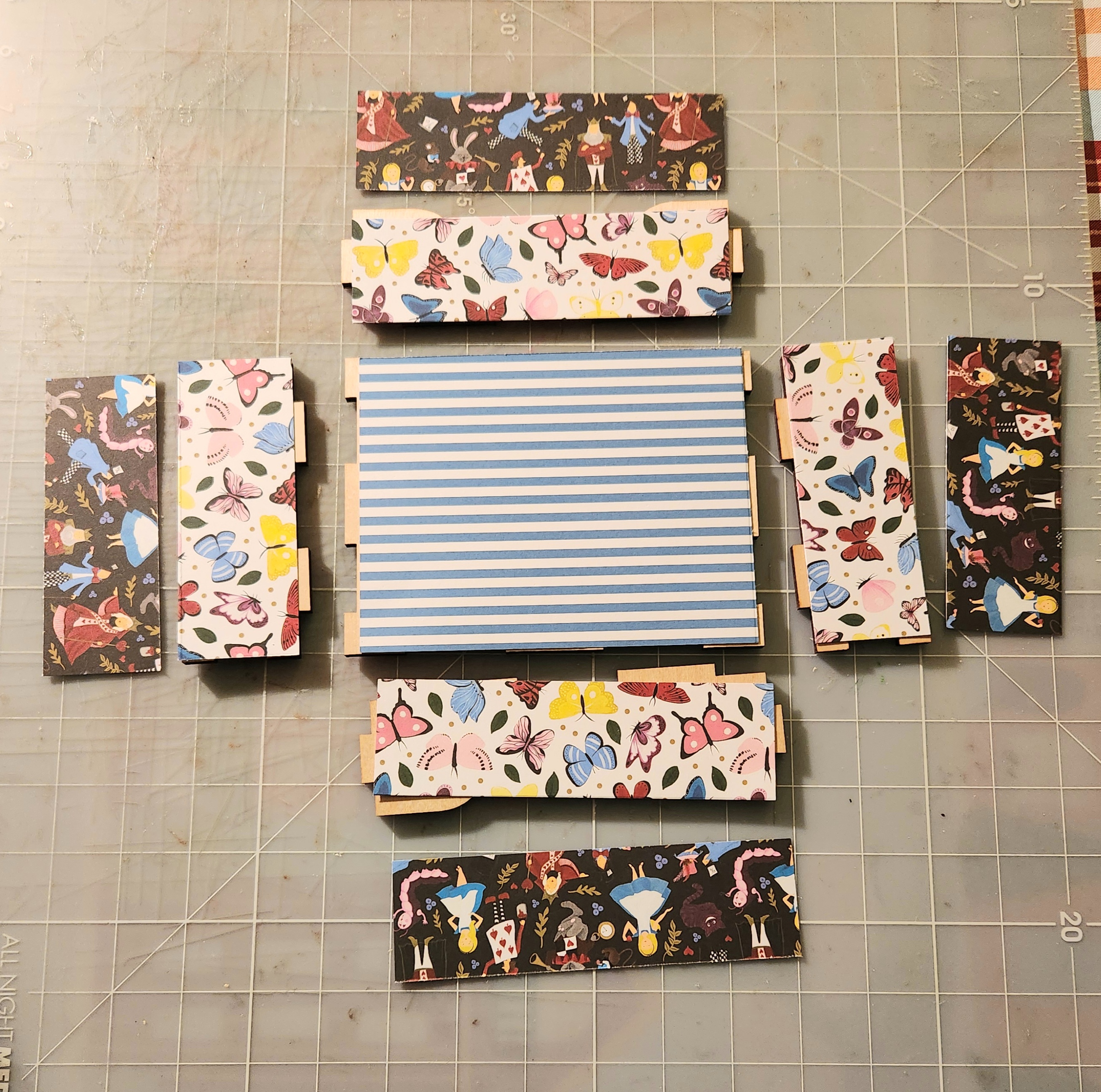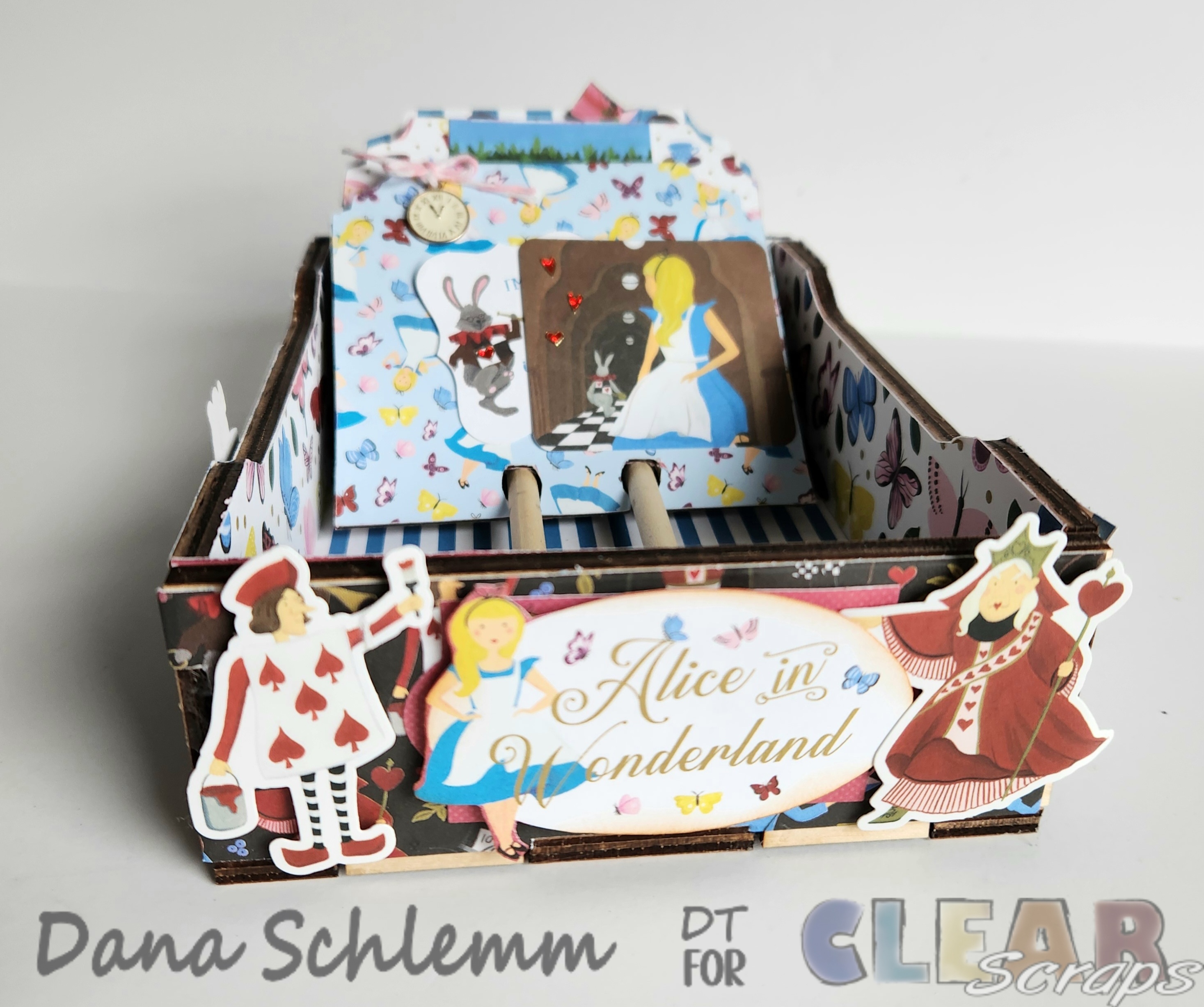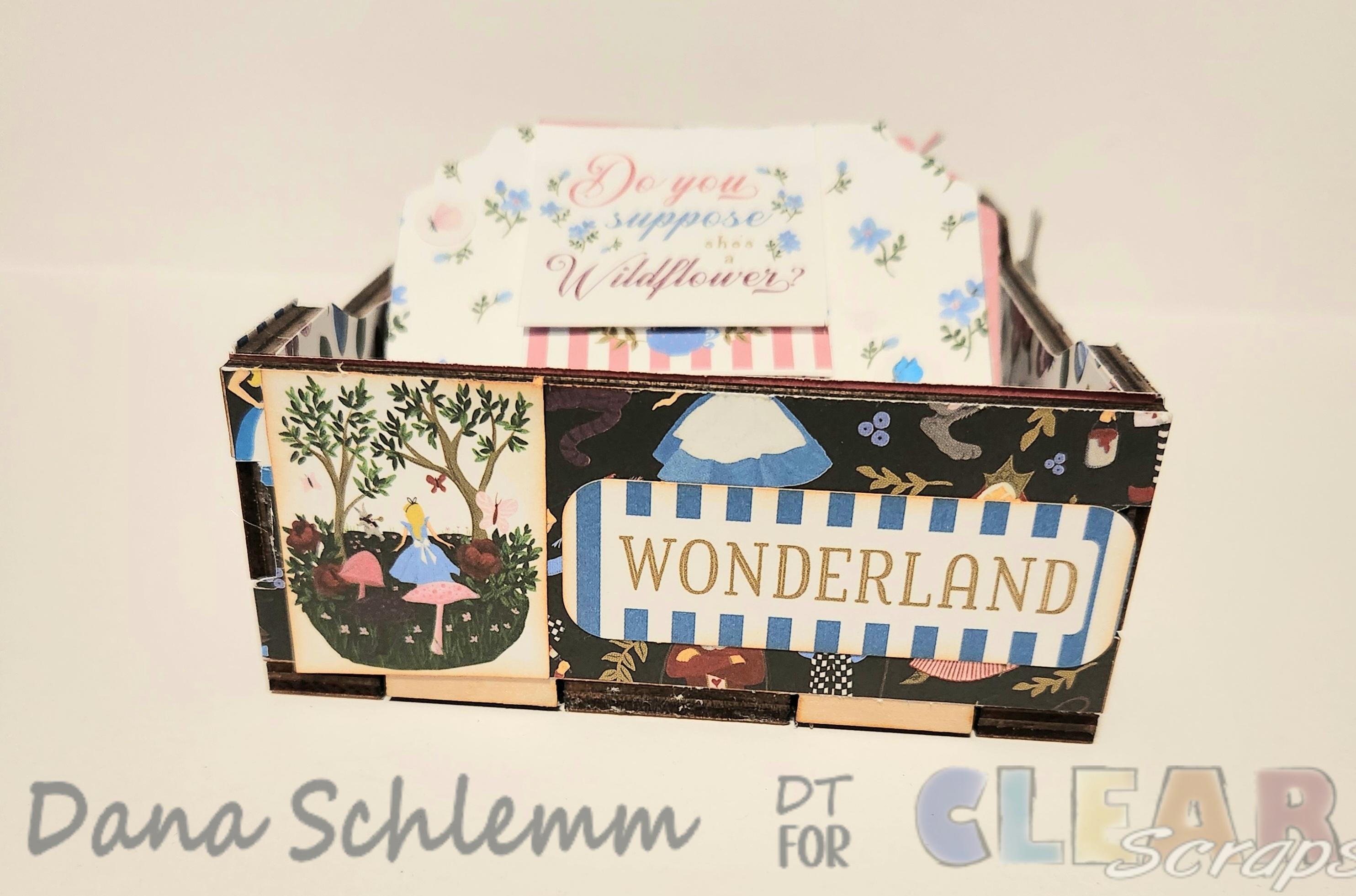 First off, we'll decorate and assemble our Clear Scraps DIY Wood box. The paper theme I chose is Echo Park's "Alice in Wonderland " collection. I adore Alice in Wonderland! But you can choose any theme or papers you have in your crafty stash!