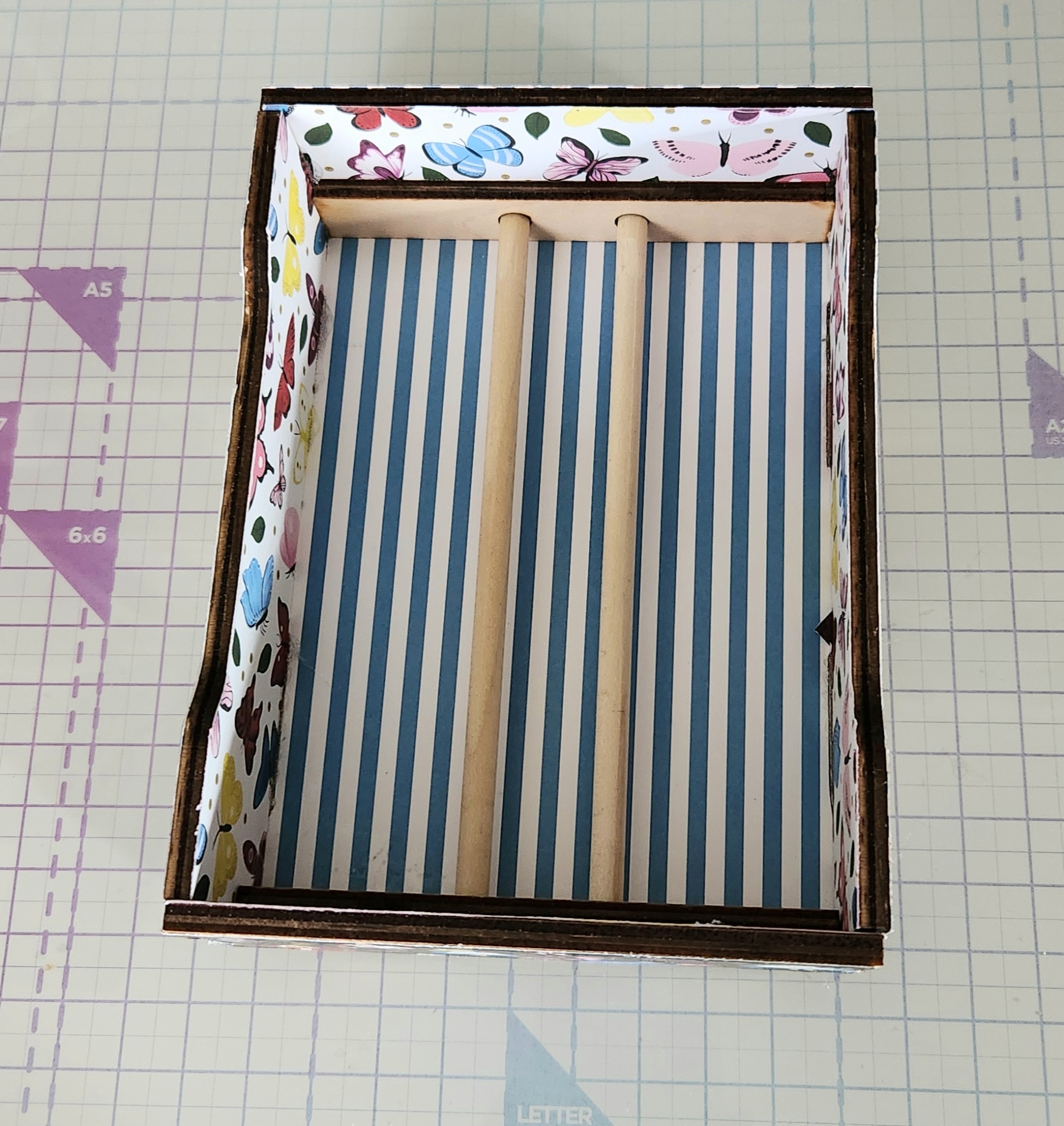 Then glue them in place. I hold the wood piece for a minute or two to get the glue to hold my pieces together. For the inside pieces, slide both wood dowels through the holes, then glue the each end to the front and back in the inside. Here's a photo of how your box should look: