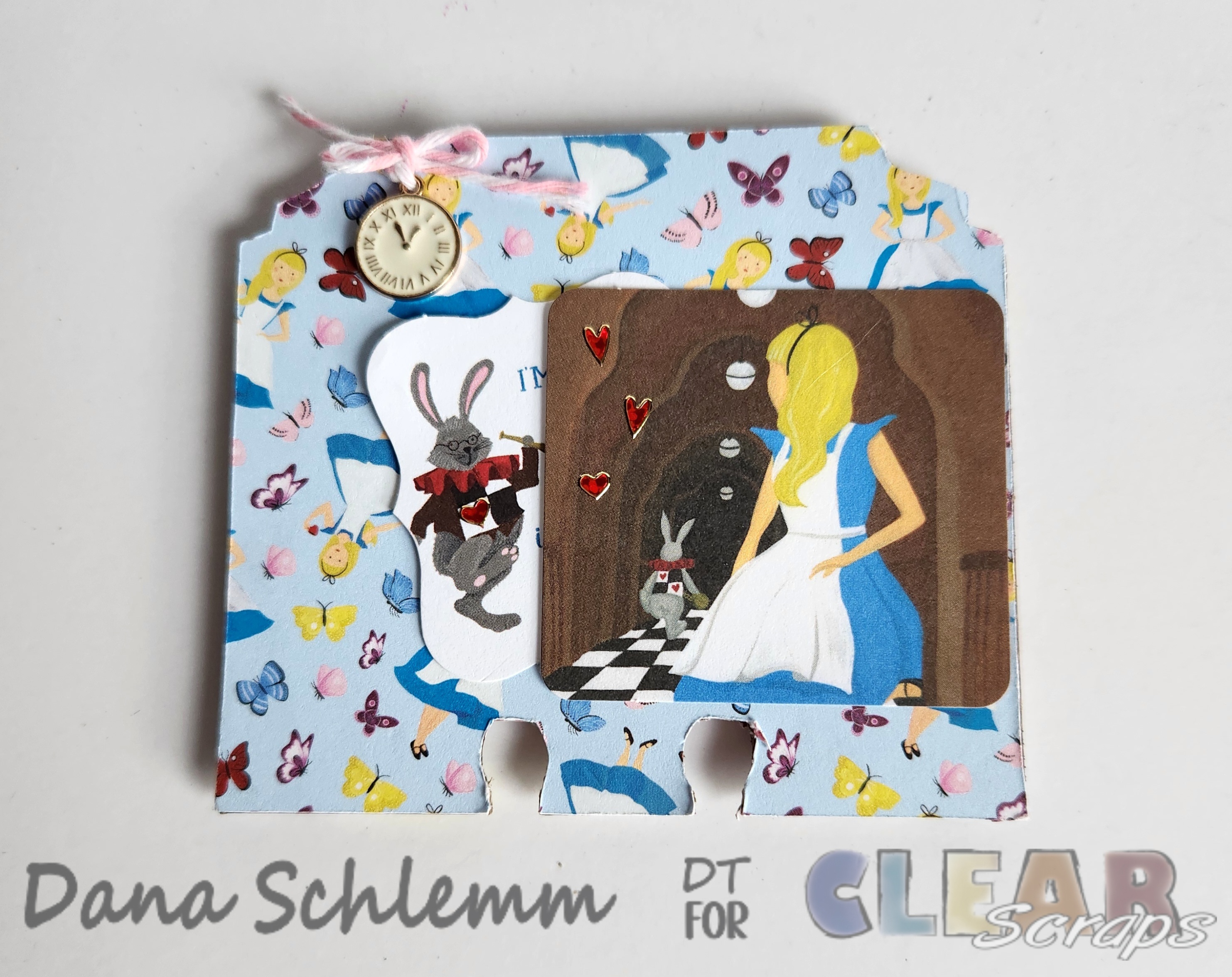 Card 1 front: I adhered an Alice ephemera card as a side pocket and tucked another small ephemera card with the rabbit inside. I applied some Dazzle tiny hearts stickers on the rabbits chest and 3 on my Alice pocket. I thread some pink twine through a pocket watch charm, then glued at the top. Here's a photo: