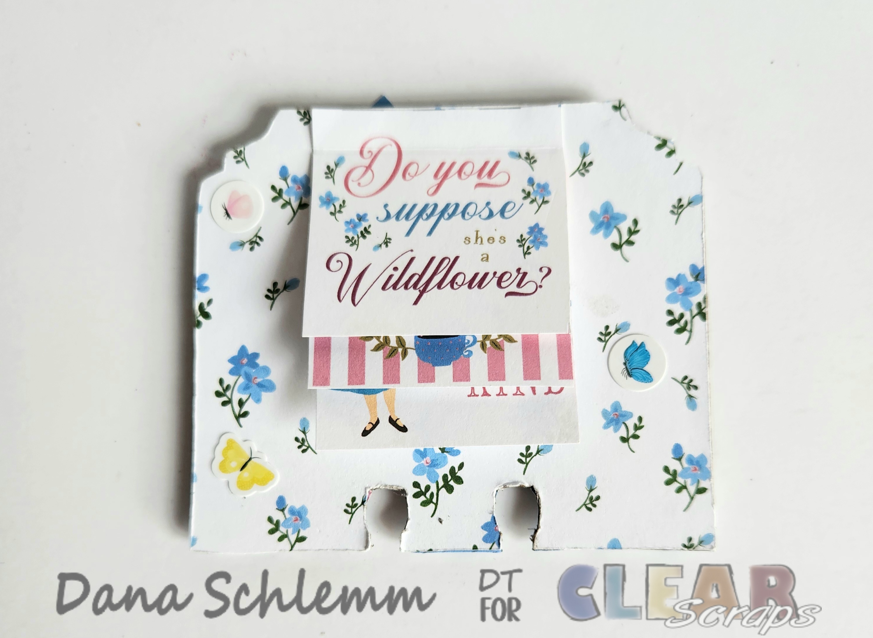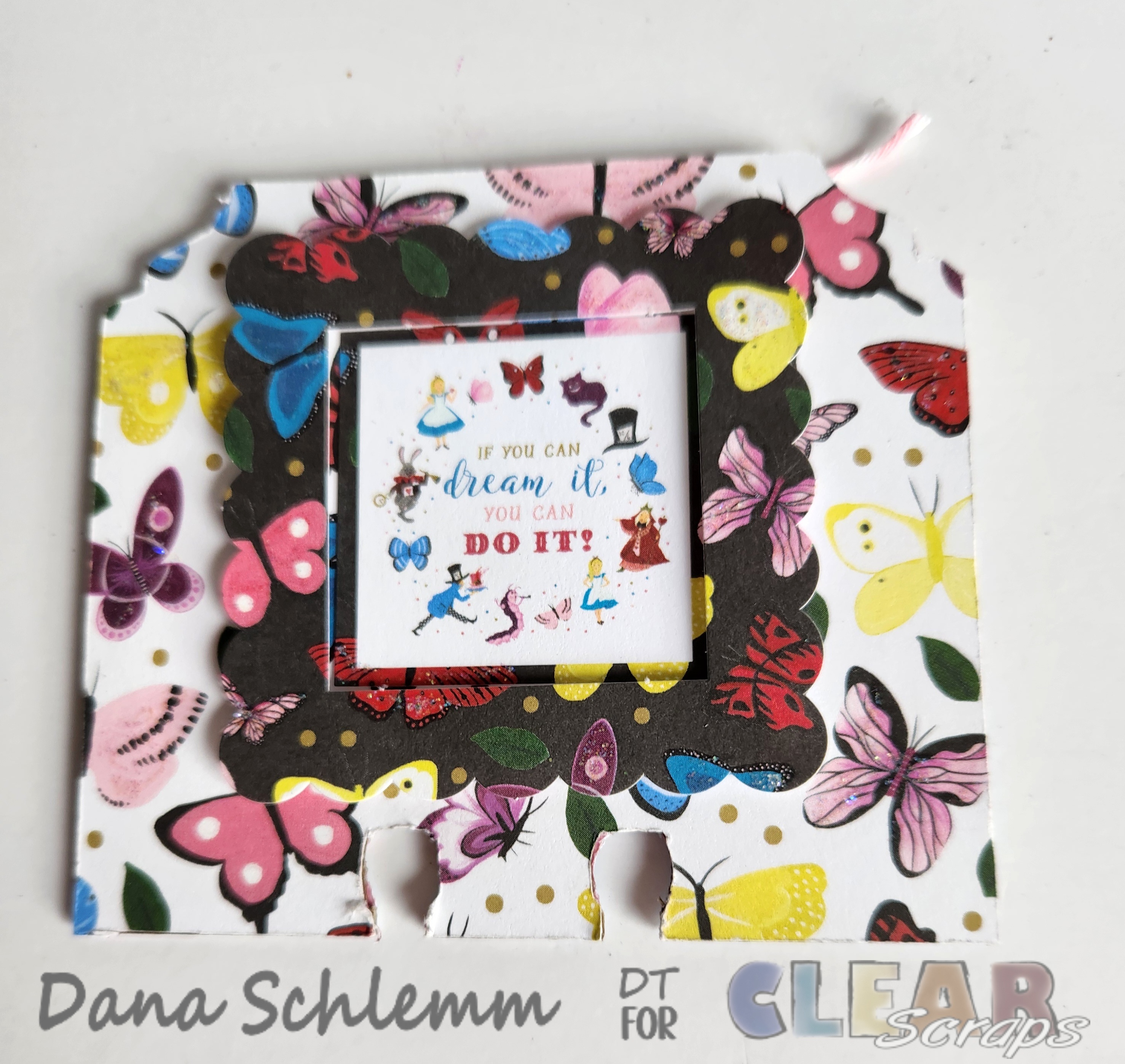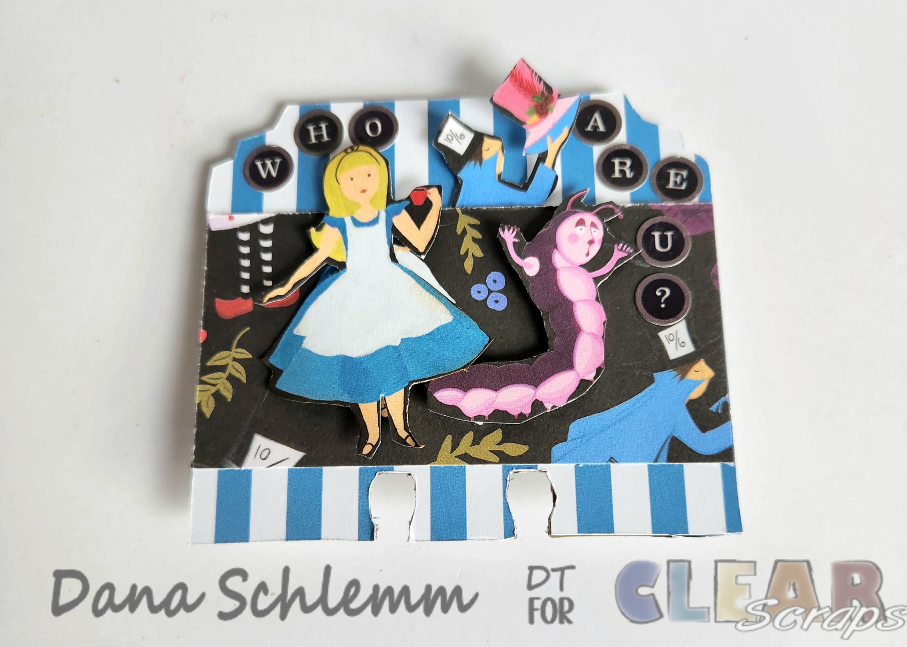 Card 3 front: I created a pocket measuring 4 x 2 inches. I cut out a few fussycut images from my scraps. Then adhered Alice and the caterpillar with foam dots on the front of my pocket. The Mad Hatter, I tucked inside my pocket. Then applied a "Who Are You" sentiment stickers along the top scattered. Here's a closeup: