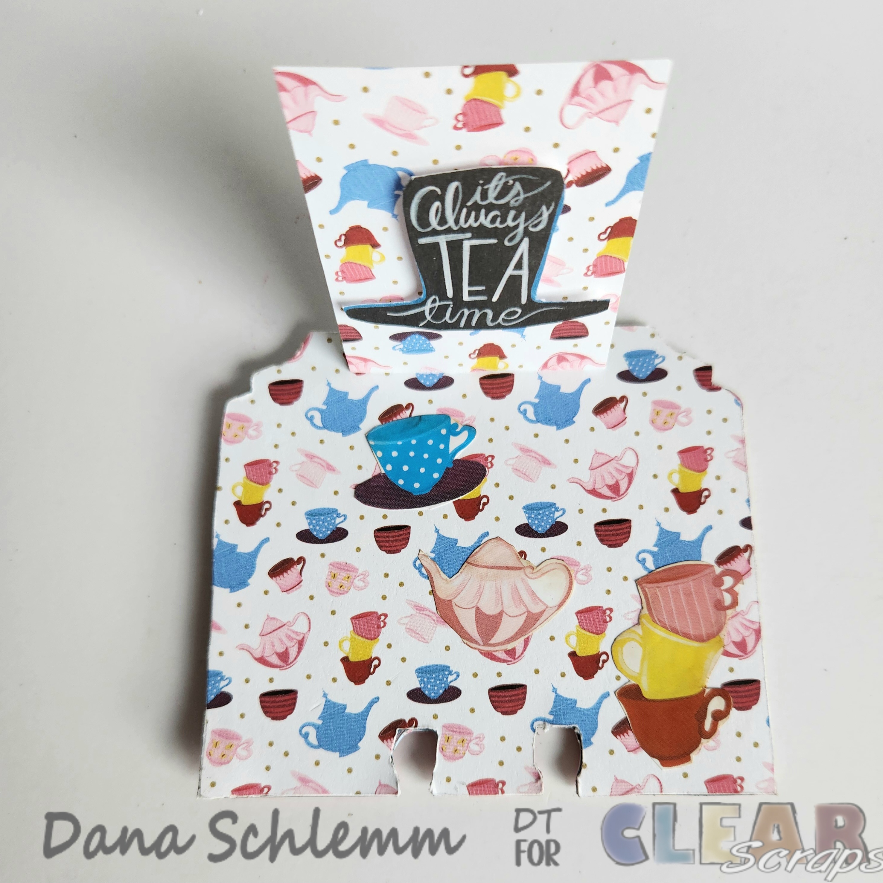 Card 2 front: I cut out a small journal card from the 6×6 paper pad and score 1/2 inch along the top edge. Then glued at the top to make a flip card. I fussycut the small journal card "it's always time for tea" and adhered on the inside of my flip card using foam dots. I fussycut a few images of the teapot and cups from the 2×12 cover sheet and adhered on my Divider card base. Here's a closeup: