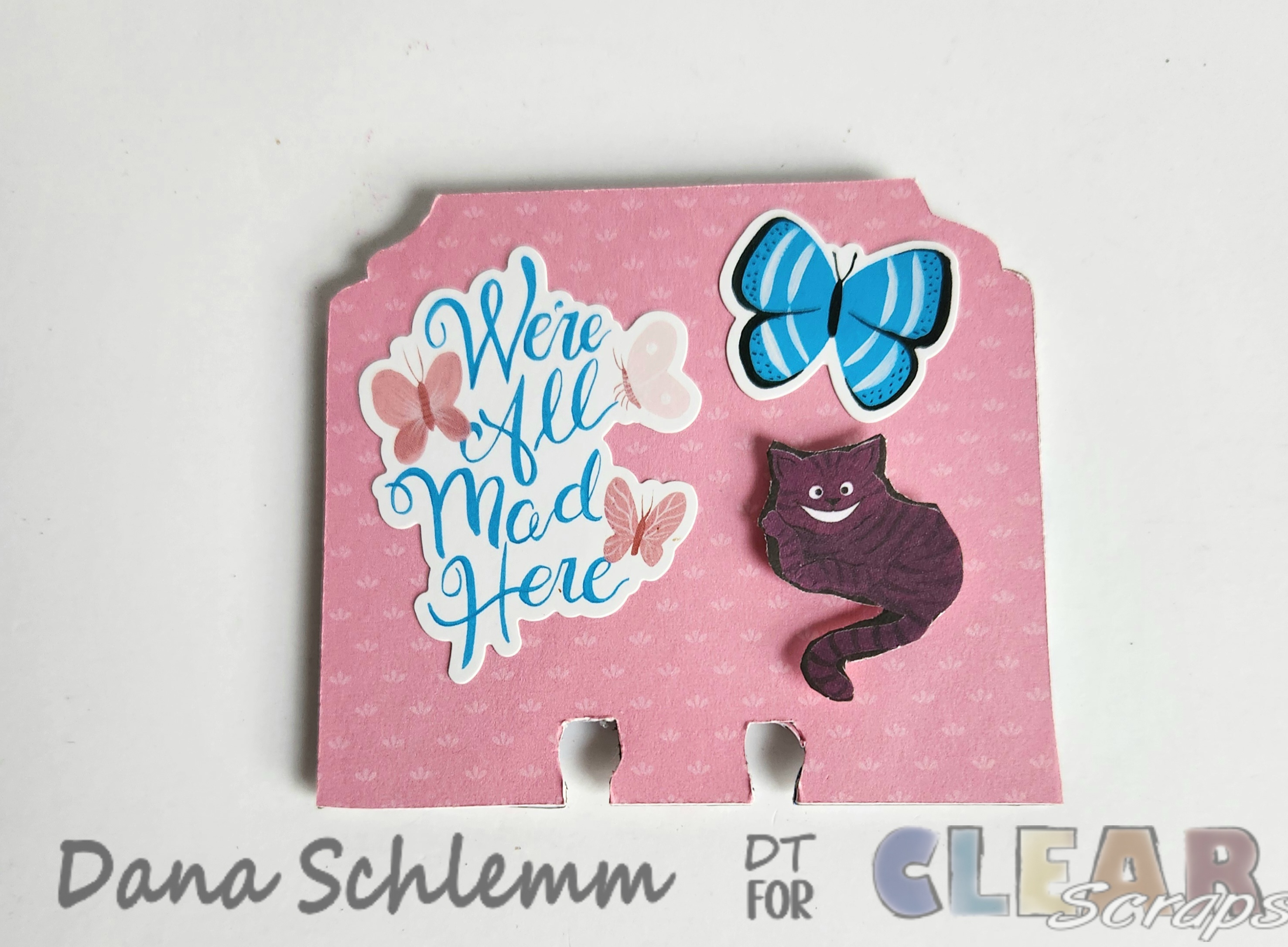 Card 2 Backside: I added a sentiment sticker on the left side and butterfly sticker at the top. I fussycut the Cheshire cart from a scrap paper and adhered with foam dots. Here's a photo: