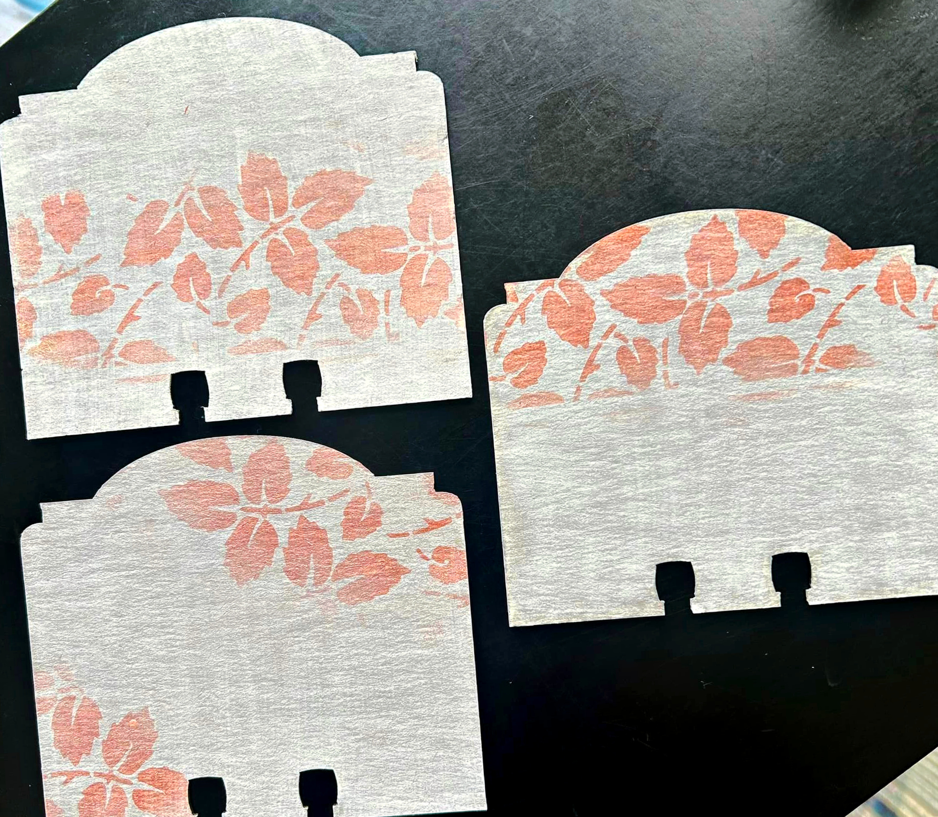This style is the Vintage Chip Dividers. They come in a 3 pack, so you've got plenty to get crafty with! And they are great to mix and match too. If you haven't checked out the different cards that are available, there are not only different shapes, but also acrylic options too! You can find them all HERE in the Clear Scraps store. This set, I started by painting with white acrylic paint. Then I grabbed the Clear Scraps 5×9 Leaves Mixer Stencil.