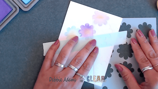 Next take the 5×9 Flowers Layering Stencil place it a little above the tape and stencil your first flower, after you have the first scoot the stencil over and ink the next flower down and keep going all over the white space.