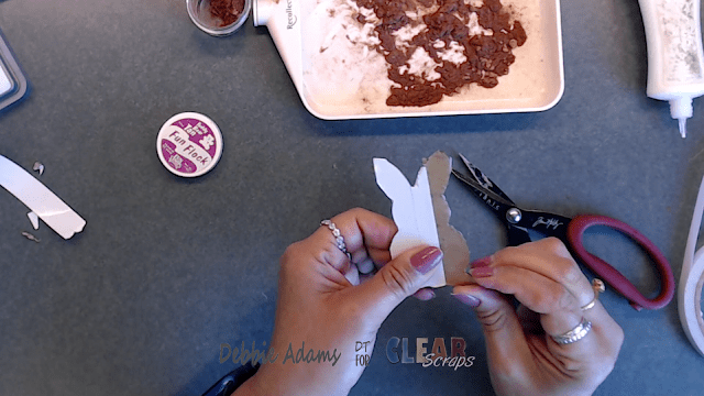 Bunnies Chipboard Embellishments. You can either use double back tape as shown below or use your glue. I do prefer the glue over the tape I feel it's just easier. After your done applying the adhesive you can place the chipboard piece in the flock and cover it all over.