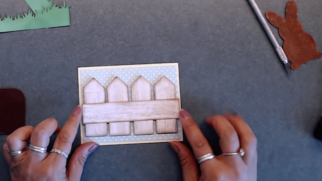 For this card I created my own picket fence out of the wooden pattern paper I had in my stash. I cut 4 pickets at 1 x 3 inches and snipped of the top portion to form the picket fence.