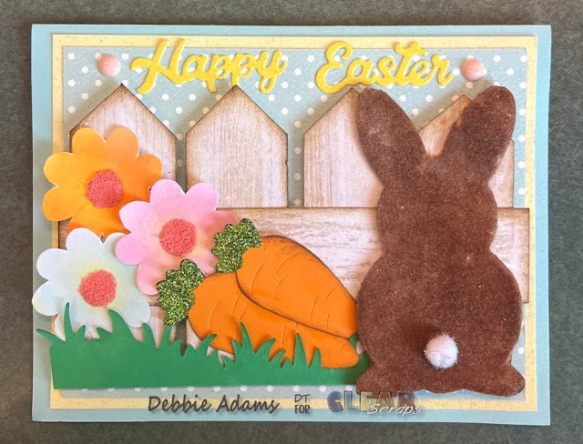 Bunnies Chipboard Embellishments on top of the fence along with the remaining stenciled flowers I fussy cut. I found the carrots and grass in my stash and added them. This turned out so adorable.