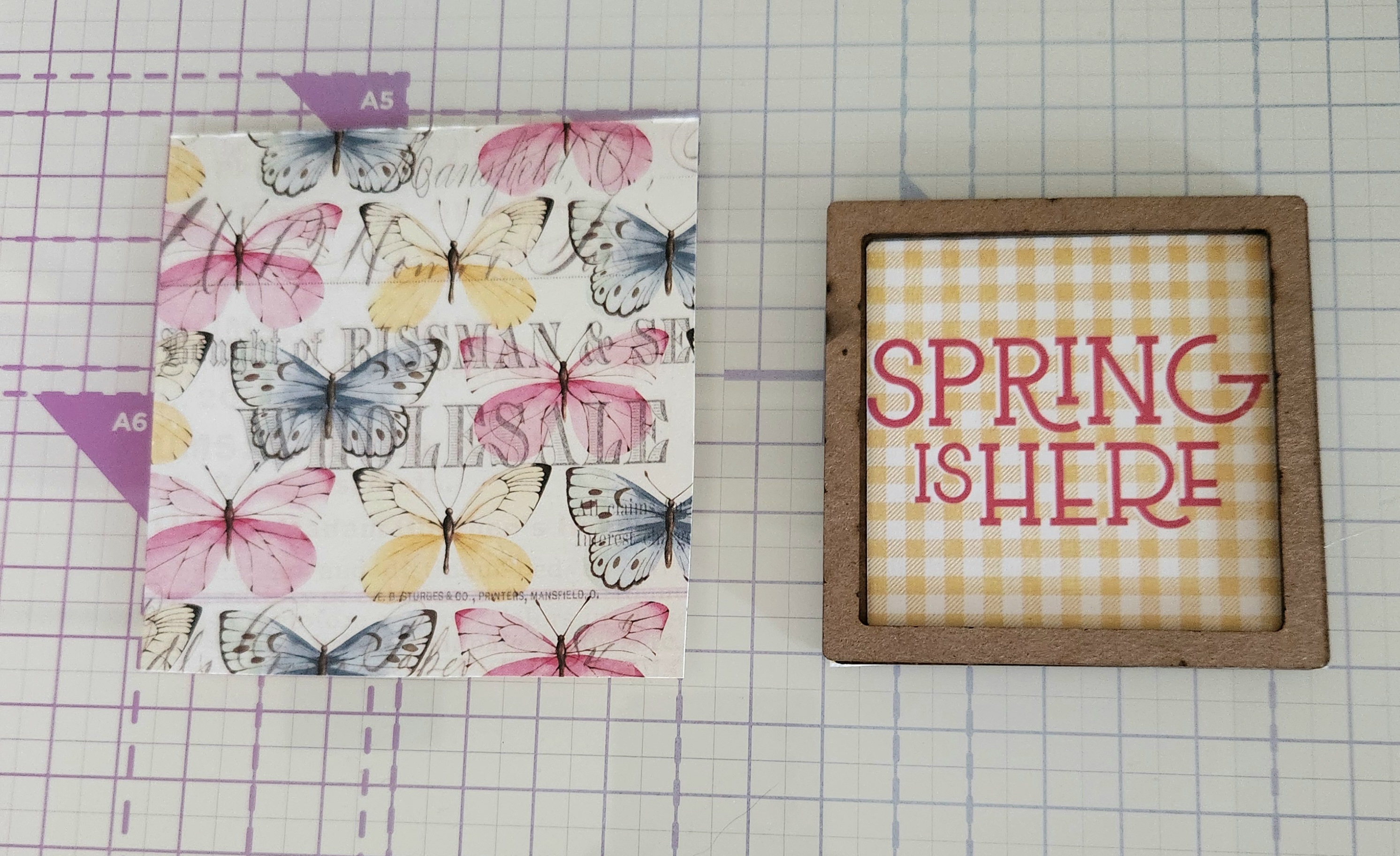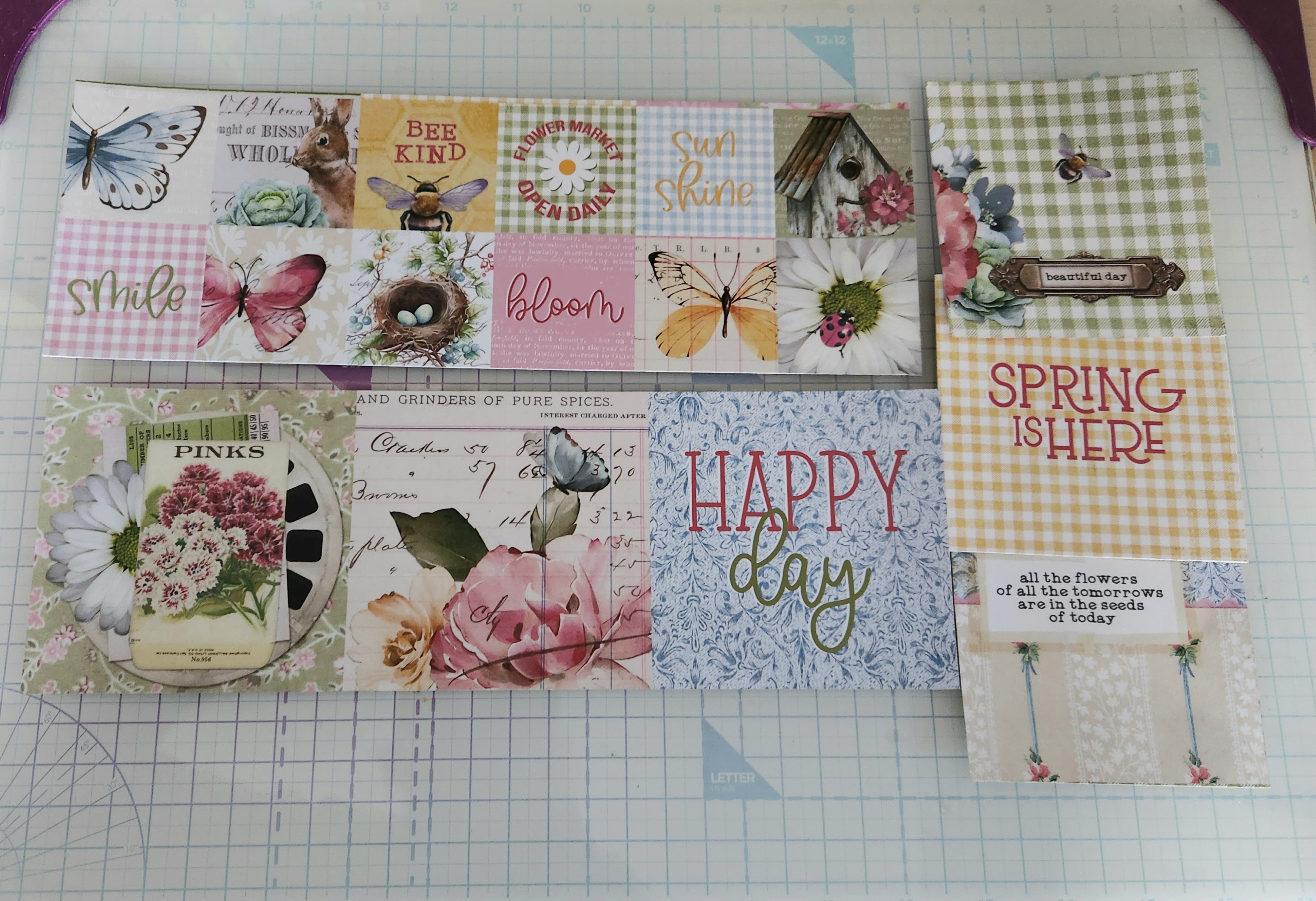 I cut out a "Spring is Here" journal card sentiment and another background paper. Glue the sentiment journal card to your bottom chipboard base. Trim away any excess paper using your x-acto knife.