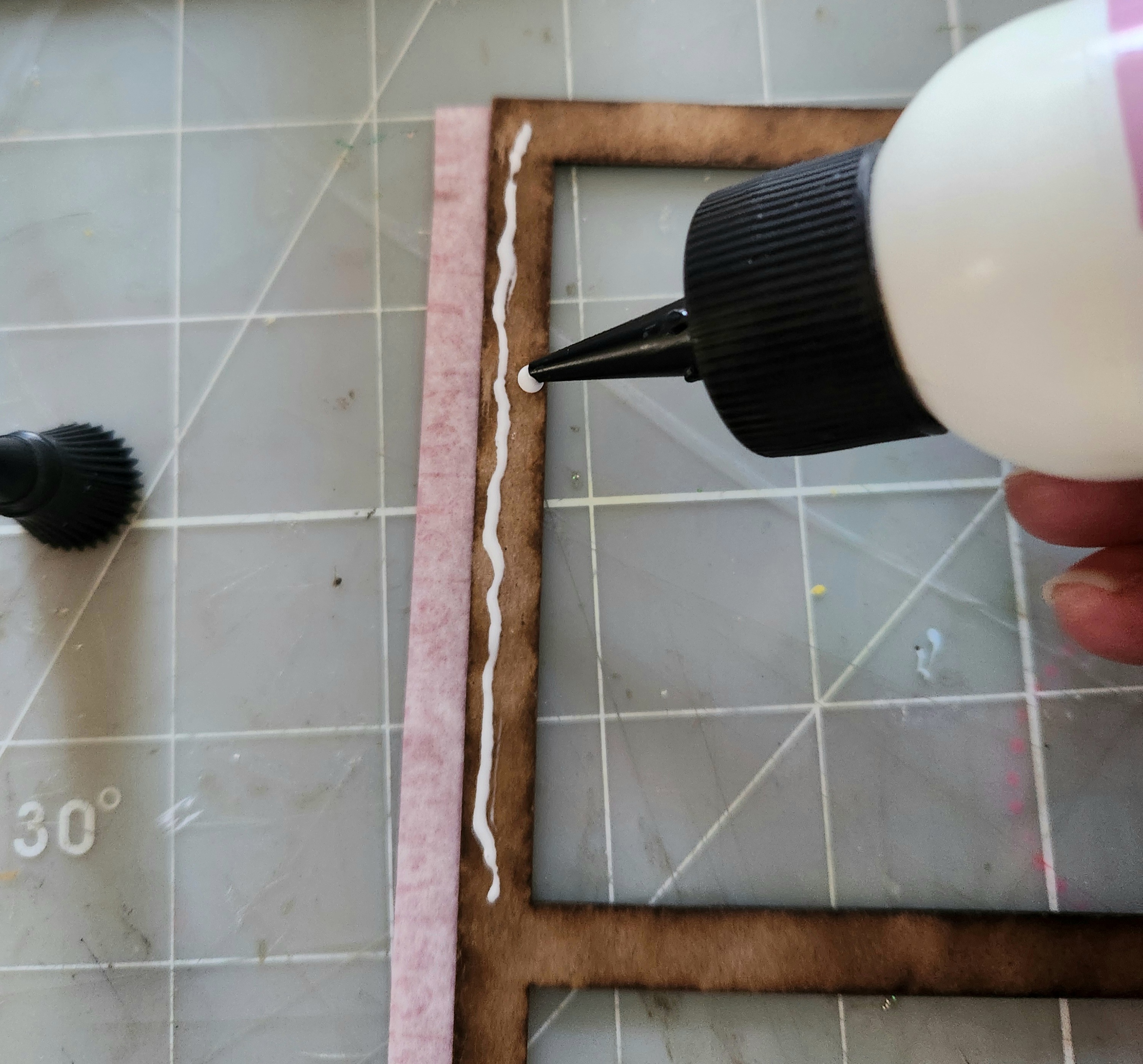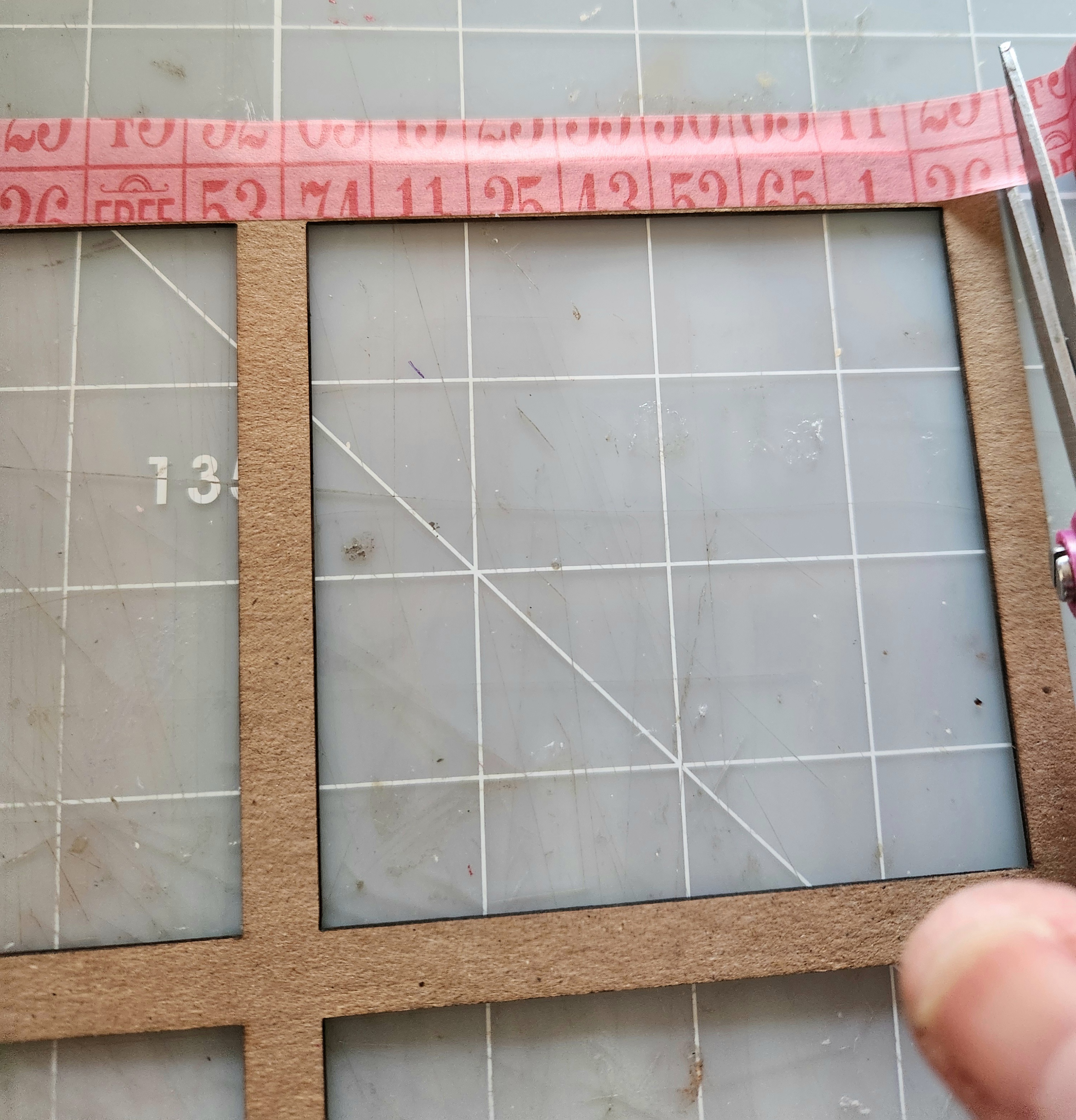 Taking a roll of matching washi tape from this paper collection, I adhered the washi tape to the front chipboard frame piece and trimmed off any excess washi tape from the end of my frame. I add a bit of glue and fold any excess washi tape to the backside to make sure it stays in place. Here's some photos: