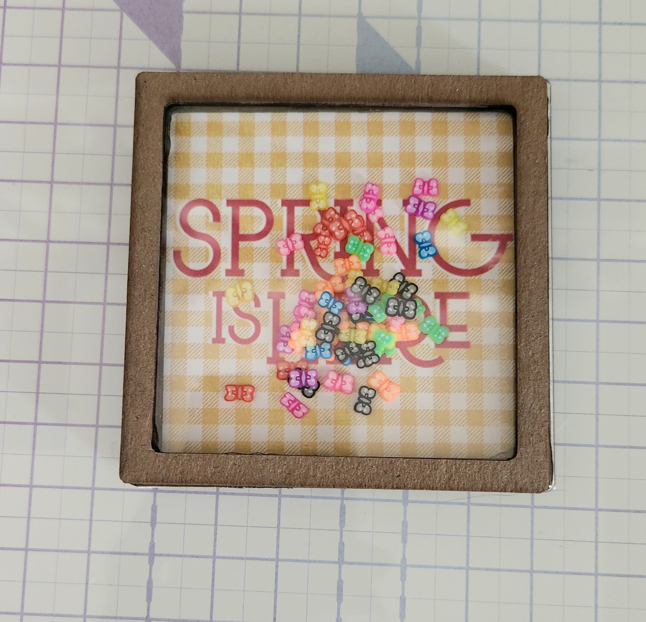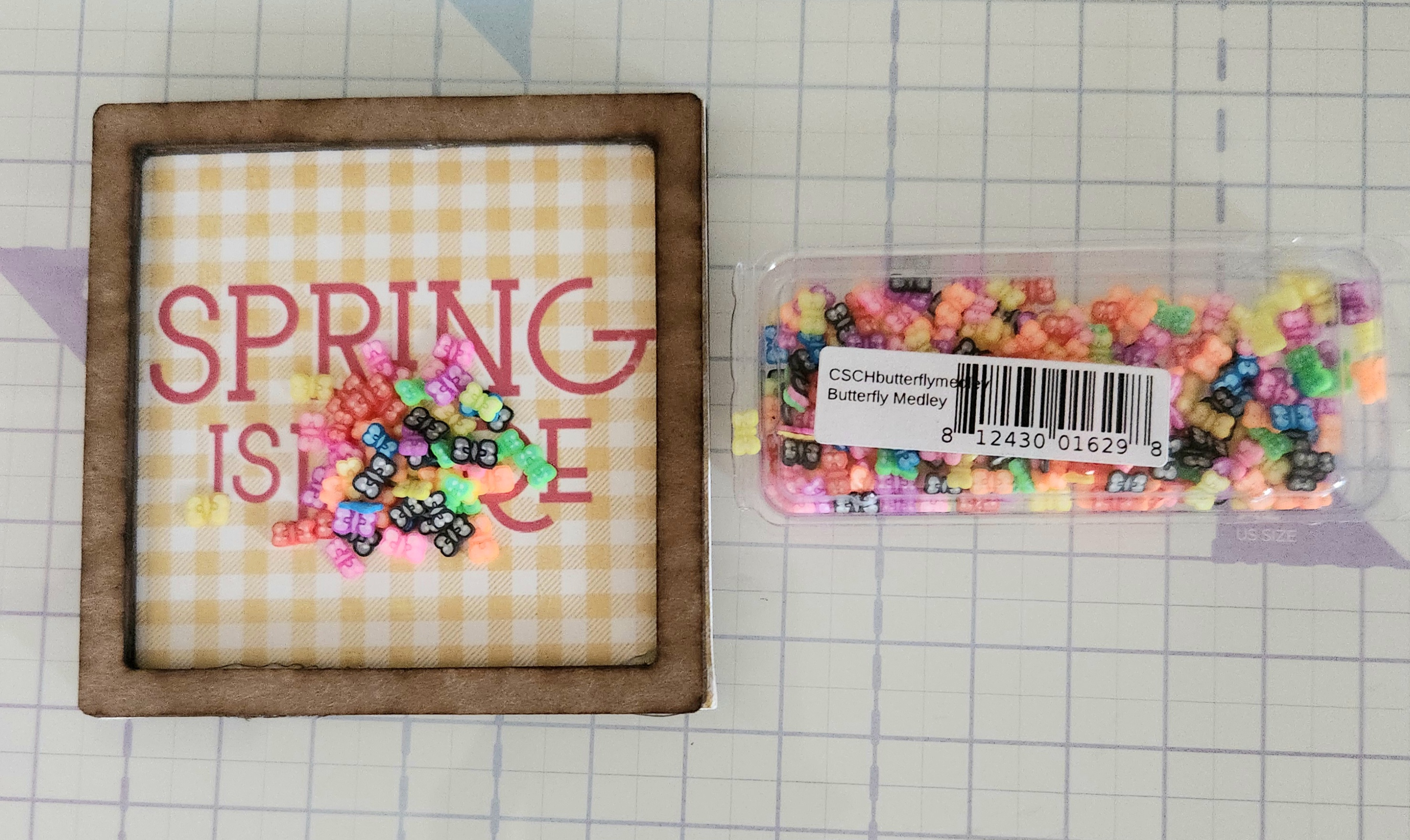 Take the next two chipboard shaker pieces and glue onto your bottom piece. Now you can add any shaker filler of your choice. I chose Clear Scraps Butterfly Medley Click here