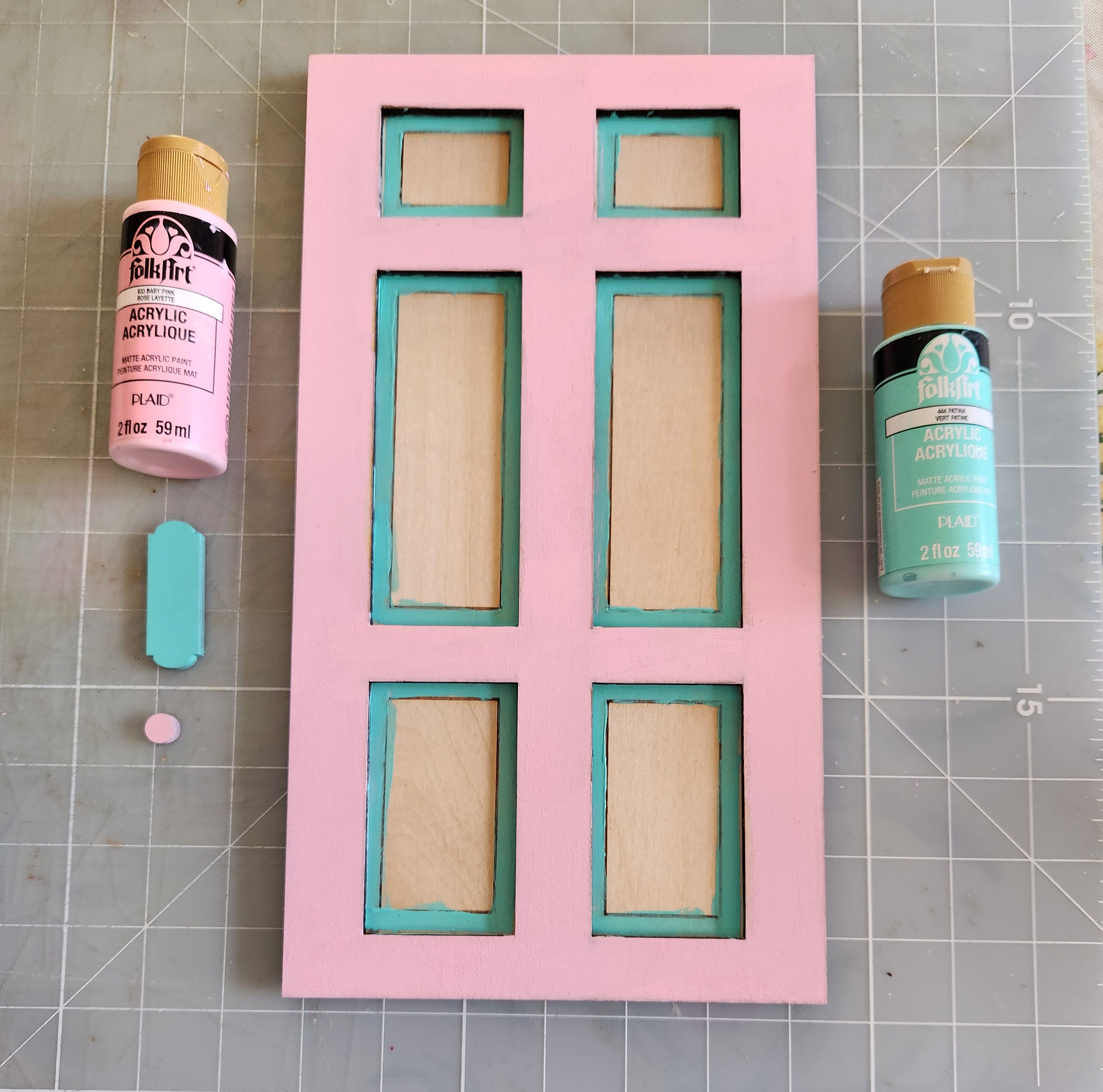 To begin, take your bottom wood door and using some acrylic paint (I chose Folkart Rose Layette and Patina. I layed my top wood door piece over top of my bottom piece. Don't glue yet. I carefully applied the Folkart Patina paint in-between the outside square areas. Then I applied the Rose Layette acrylic paint onto my top door piece. I took the wood door bracket and doorknob and added acrylic paint to each piece. See photo: