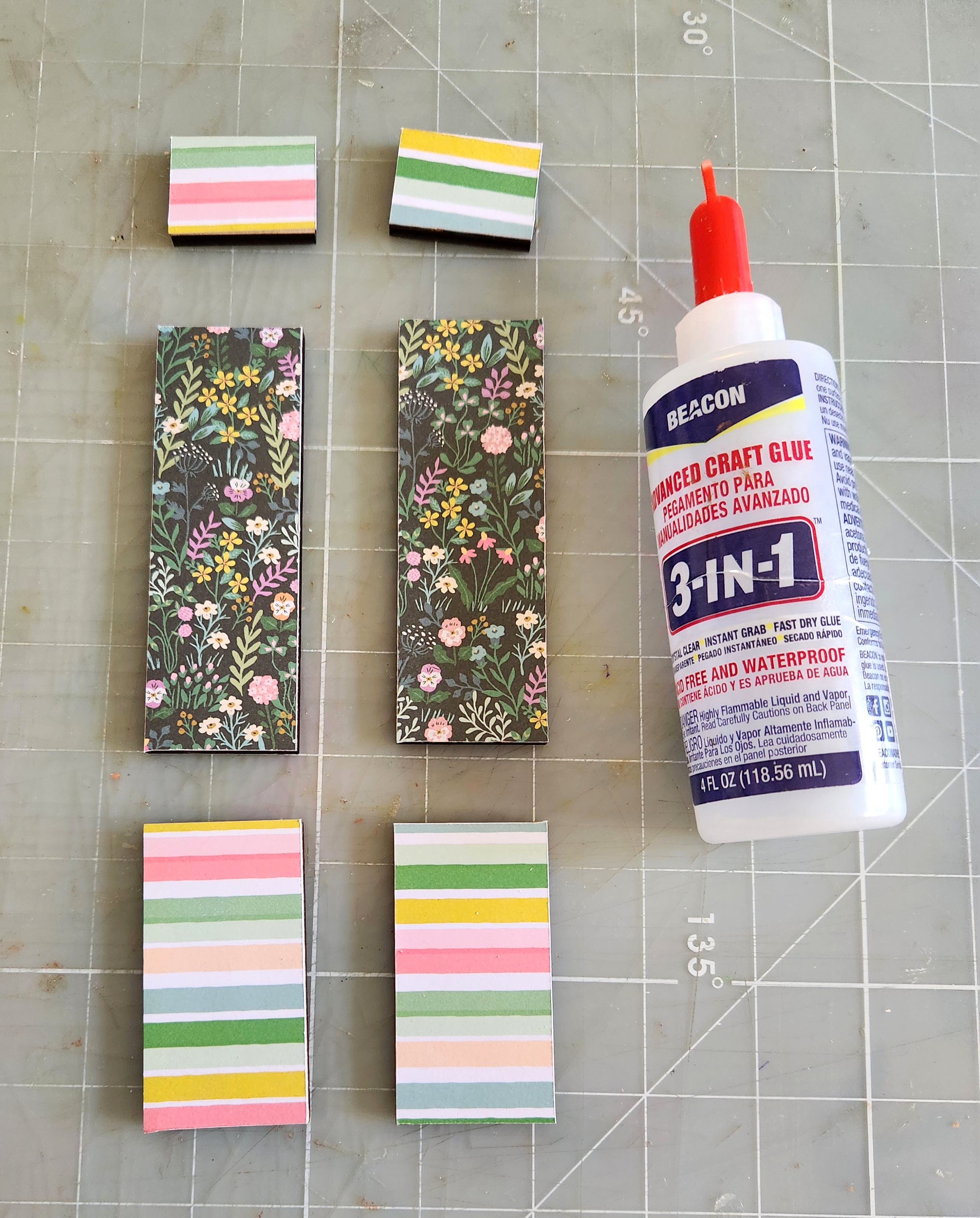 Set this aside to dry. Next take all your various size square pieces. You can paint, stamp or cover with patterned paper. I chose to cover mine with coordinating papers from Maggie Holmes "Garden Party" collection. I trimmed away any excess paper using my x-acto knife. If needed, you can use a Distress tool to smooth any rough edges away. I chose to add Distress Ink Gathered Twigs onto the edges of my wood pieces. I recommend using Beacon glue to adhere my papers to my wood pieces.