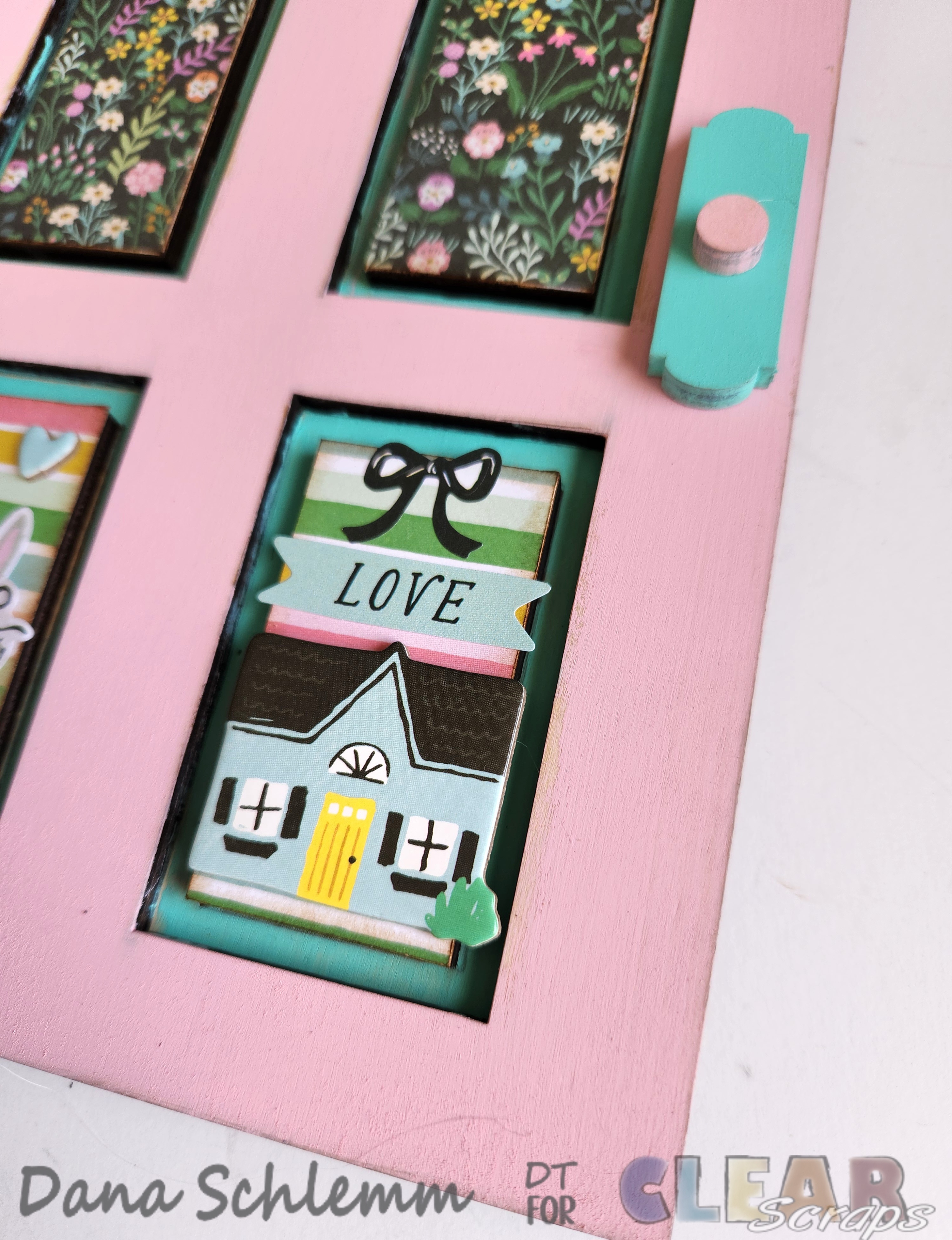 Now you can decorate your wood door as you like. I used a variety of chipboard stickers and adhesive stickers. On the bottom section on my door, I glued a small light pink pompom on my bunny's tail.