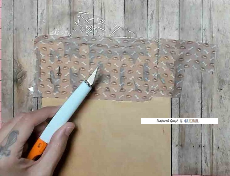 Allow the ink to dry. Remove the tissue paper from the cardstock. Lay the cling film over the “Friends”. Lay your patterned tissue paper on top of that and then your parchment paper. Using your iron on the hottest setting (NO steam), iron over the entire word. Apply gentle pressure.