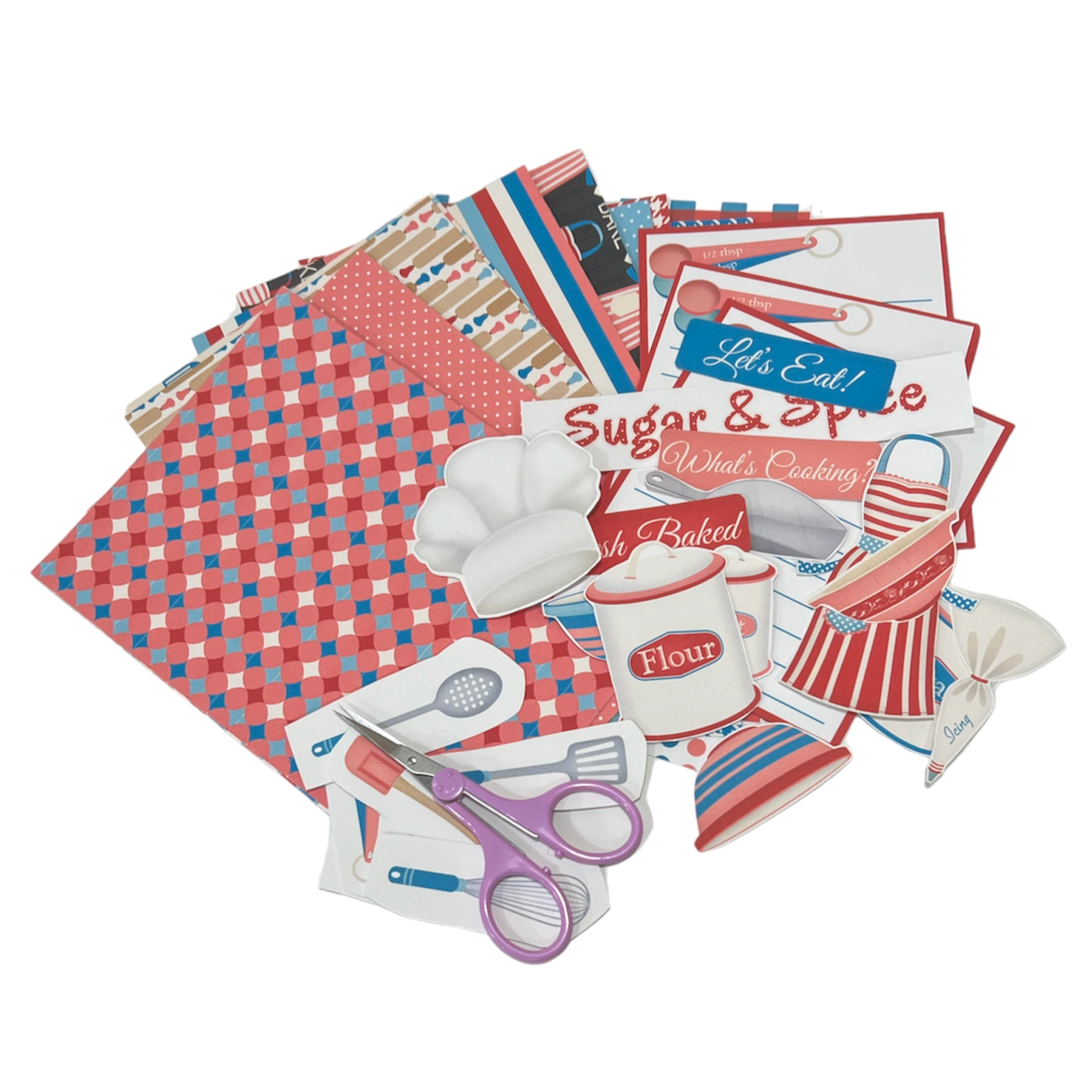 Since this is a baking album, I am using Sugar & Spice Clipart & Papers Scrapbook Kit which I downloaded and printed from the Scrapbook Gems Etsy Shop. I love the colors in this collection and thought they would be perfect for this album. Also included in this kit are baking elements which are perfect for embellishing. I really like using digital downloads because they can be printed in different sizes.