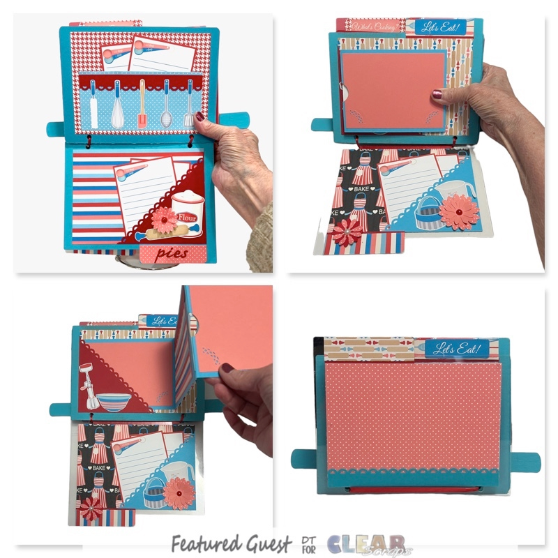 I added 5 1/4 x 3 3/4 inch pieces of card stock on both sides of 2 of the panels and 1 of the third. Using a corner punch and a border punch I created areas where recipes or photos can secured. You can also slip recipes or photos underneath the scalloped borders on the center panels.(4)