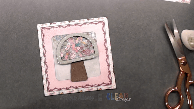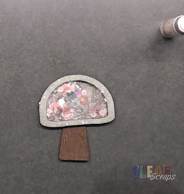 mushroom shaker on my pattern paper then I adhered glitter glass to the top frame of the mushroom and adhered that to the acetate.