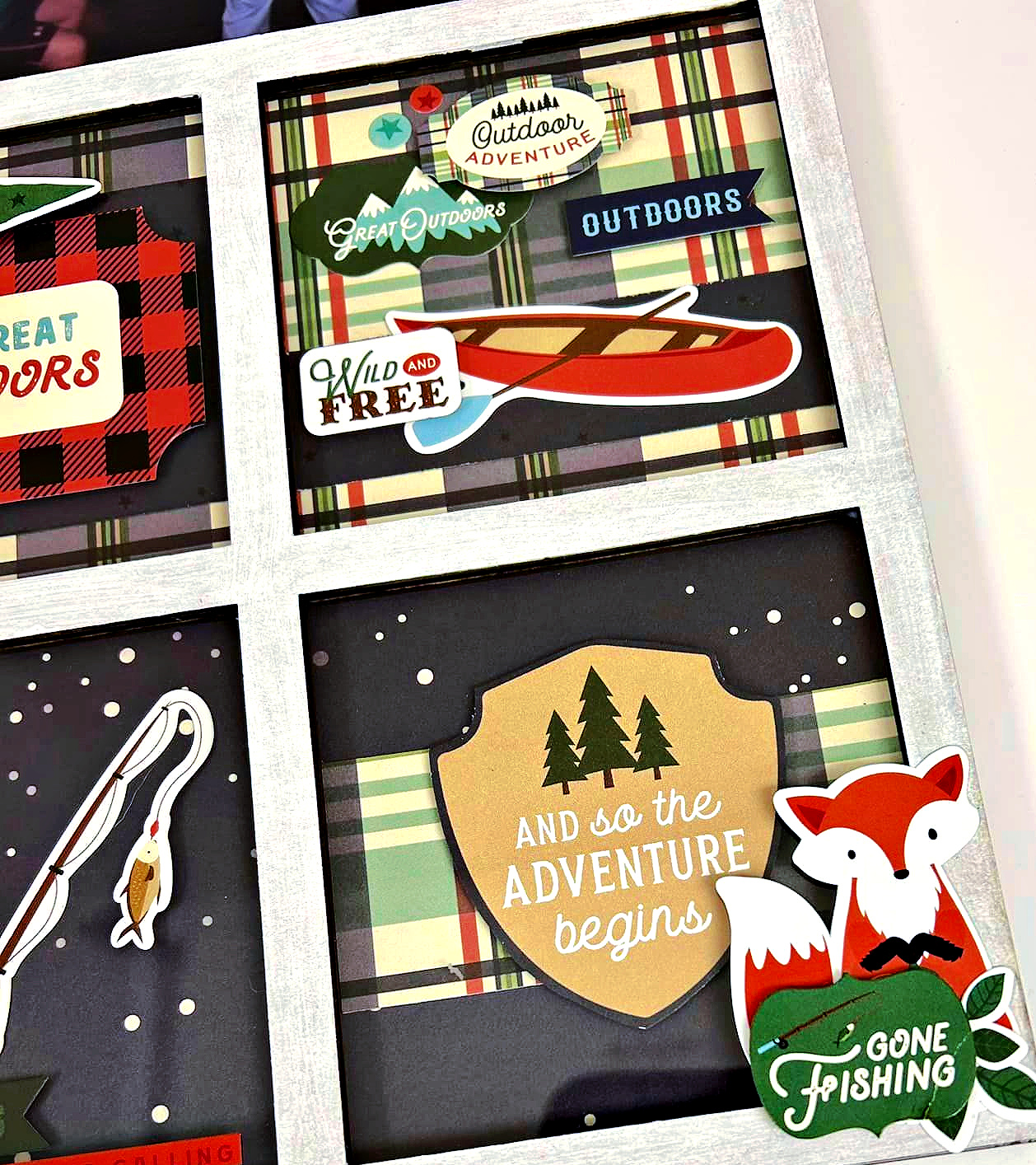 These are such fun options to use to create a piece of home decor you can display year round! Especially if you want to highlight just a few of your favorite pictures from a vacation, outing or event! The tray used in this project is the Rectangle/Square Printer Tray Frame. This one is a fave because you can use full size pics and leave all of the length if you'd like. The height is around 3&1/2 inches so you only have to trim a wee bit. You can always put photos in every single square/opening if you'd like as well. They are fun to do this way also, with embellishments–almost like a full scrapbook page. The best way to start, is to paint the top frame piece and set aside to dry (you can spray with ink, stencil, stamp, etc as well). Next up as that dries–work on the layout.
