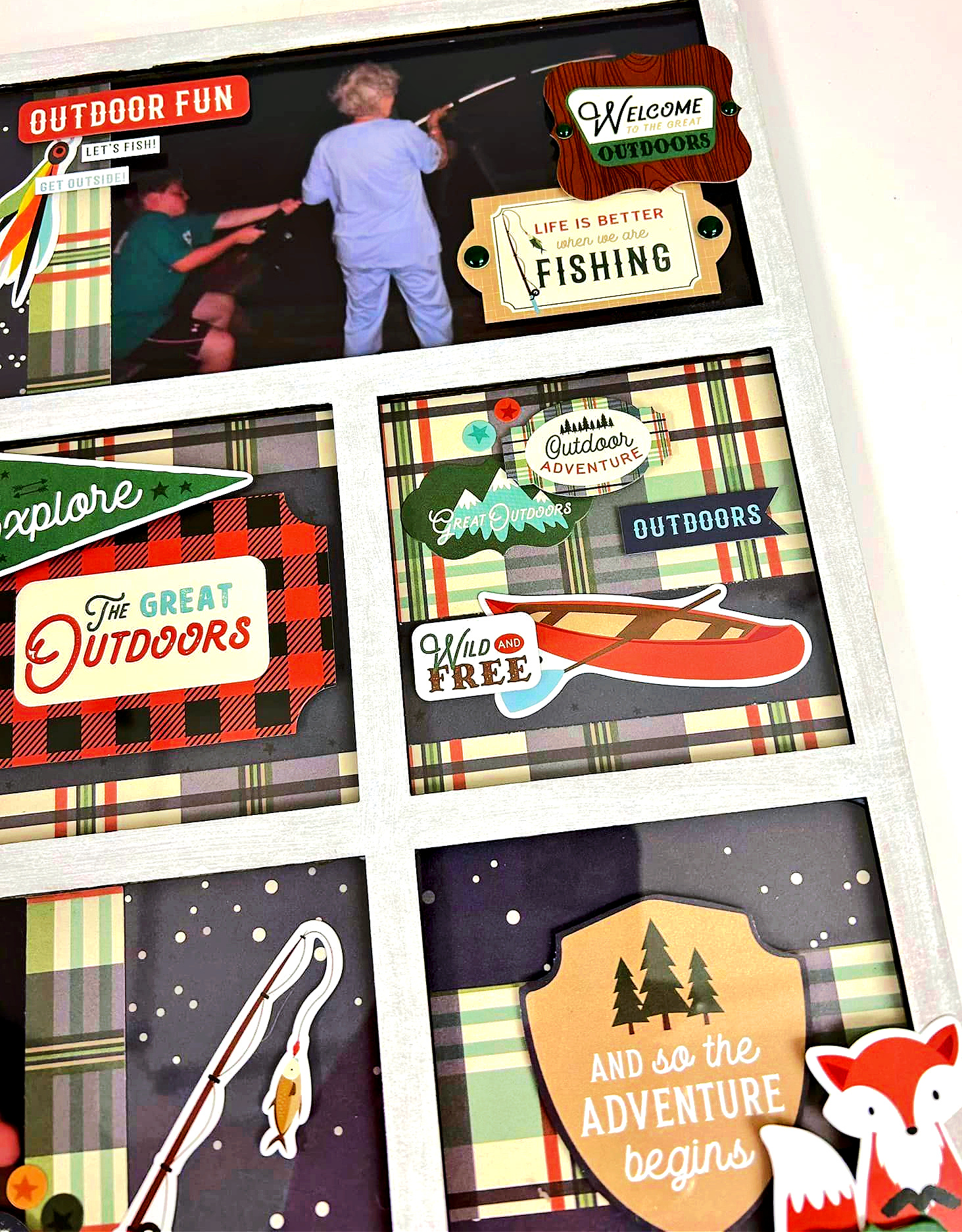 You can see here how some stickers and embellishments are on the inside of the frame, and some are then on the outside after it's fully assembled. I use foam tape both inside and outside. Plenty of room! You can throw in some sequins or something similar if you'd like too! I went for the cleaner look here.