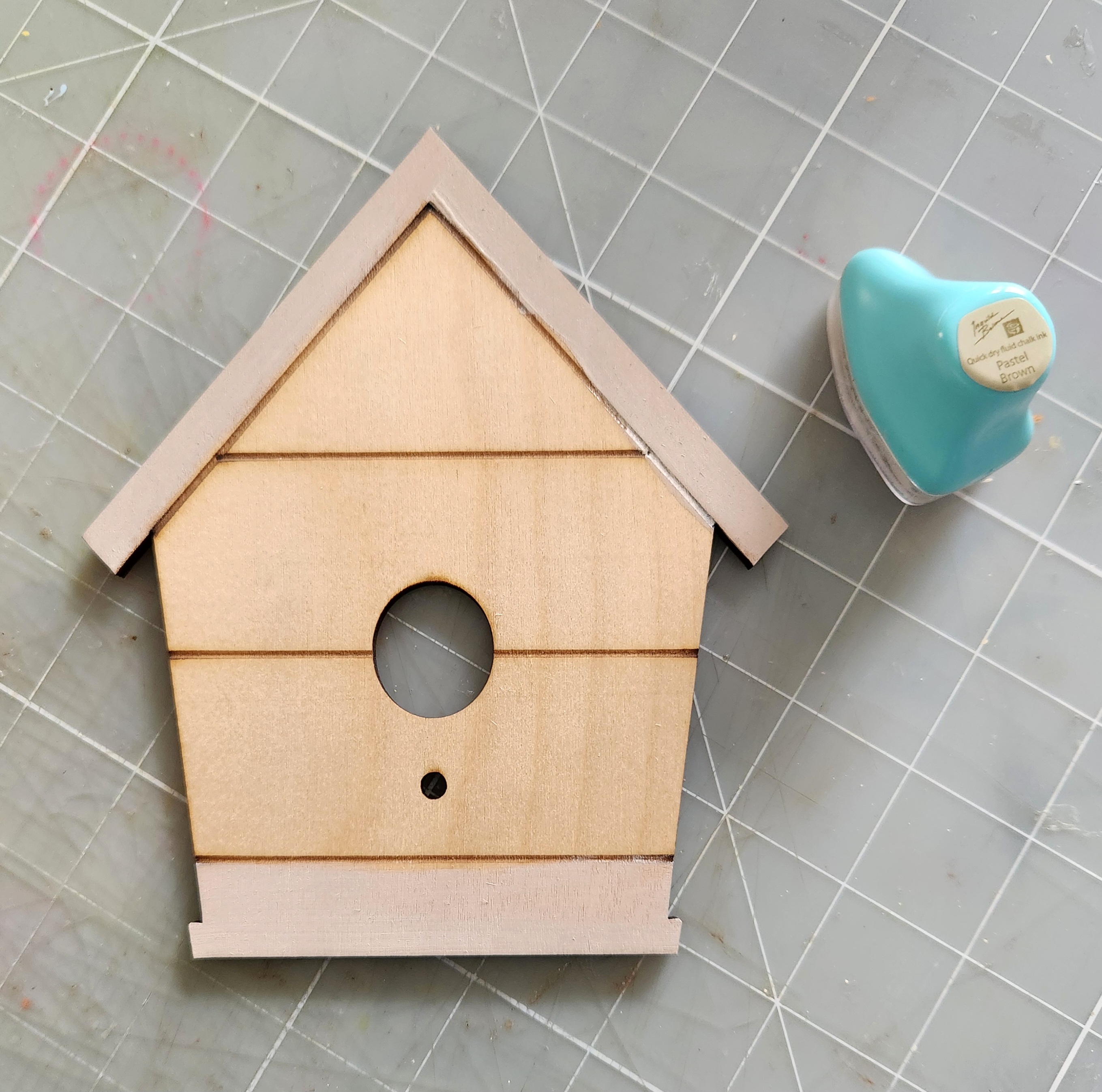 To start this project, rremoveyour Shiplap Birdhouse from your package. Taking some Prima Pastel Brown Chalk Ink, I applied on the roof of my Birdhouse and bottom section. Let dry.