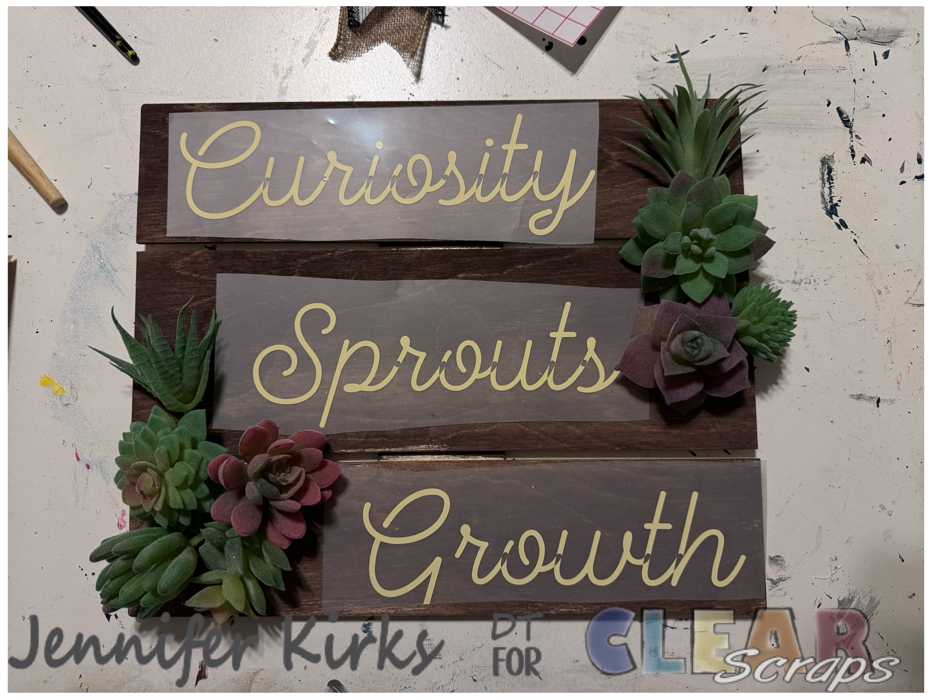 Following that, I utilized my Cricut machine to cut out the words "Curiosity grows here" from cream vinyl. Carefully arranging the vinyl lettering on the shiplap surface, I gently rubbed it onto the sign for a secure fit. Next, I delicately removed the stems from the plastic flowers and arranged them alongside the vinyl lettering. Using a hot glue gun, I then affixed the plastic succulents onto the sign, ensuring they were securely attached.