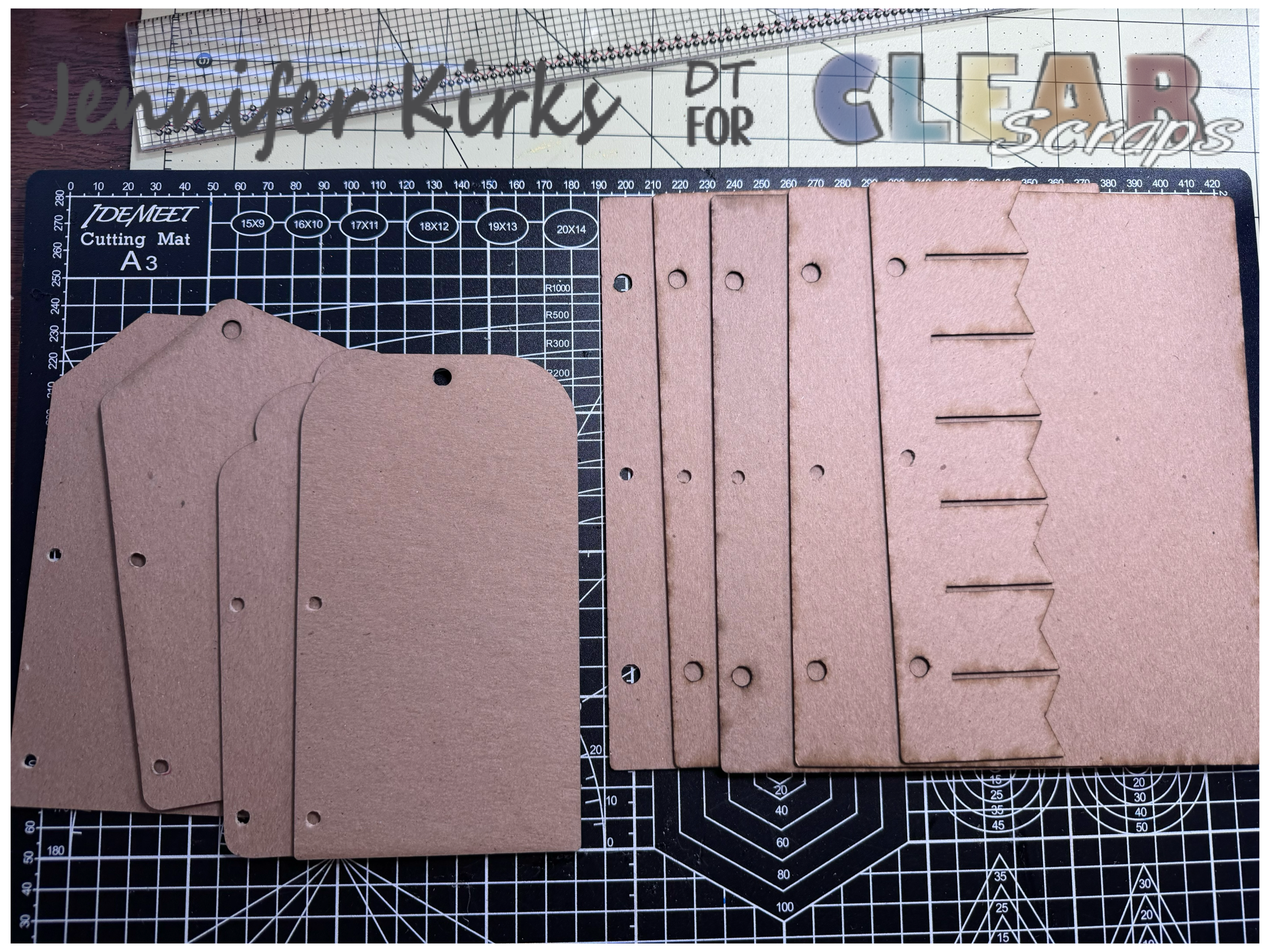 To add a unique touch to the album, I rotated the chipboard album and tags throughout its pages. For each page and tag, I meticulously traced the shapes, carefully cutting them out with scissors before refining the edges with an exacto knife for a precise finish. I find the exacto knife particularly effective for achieving clean edges close to the chipboard.