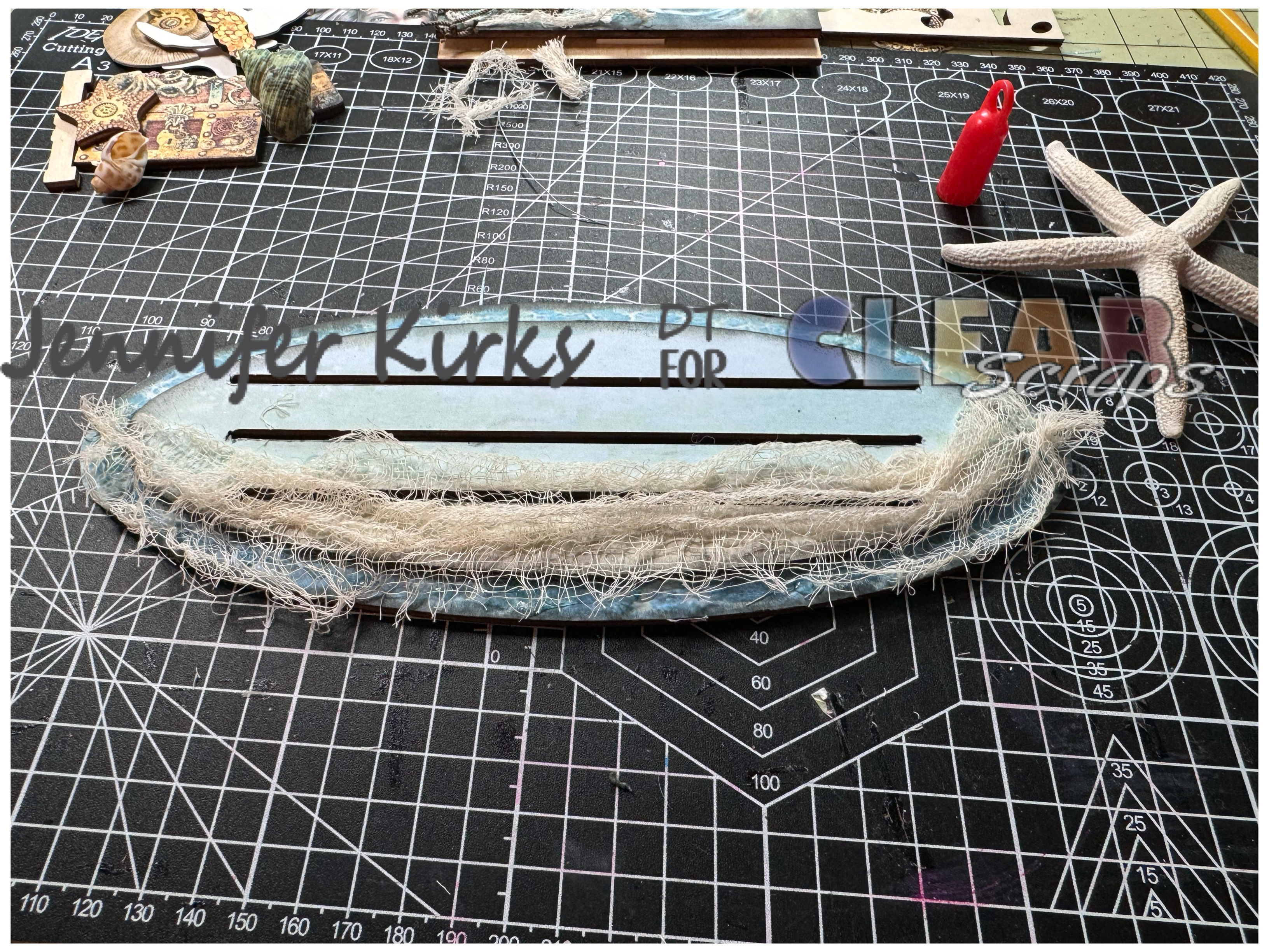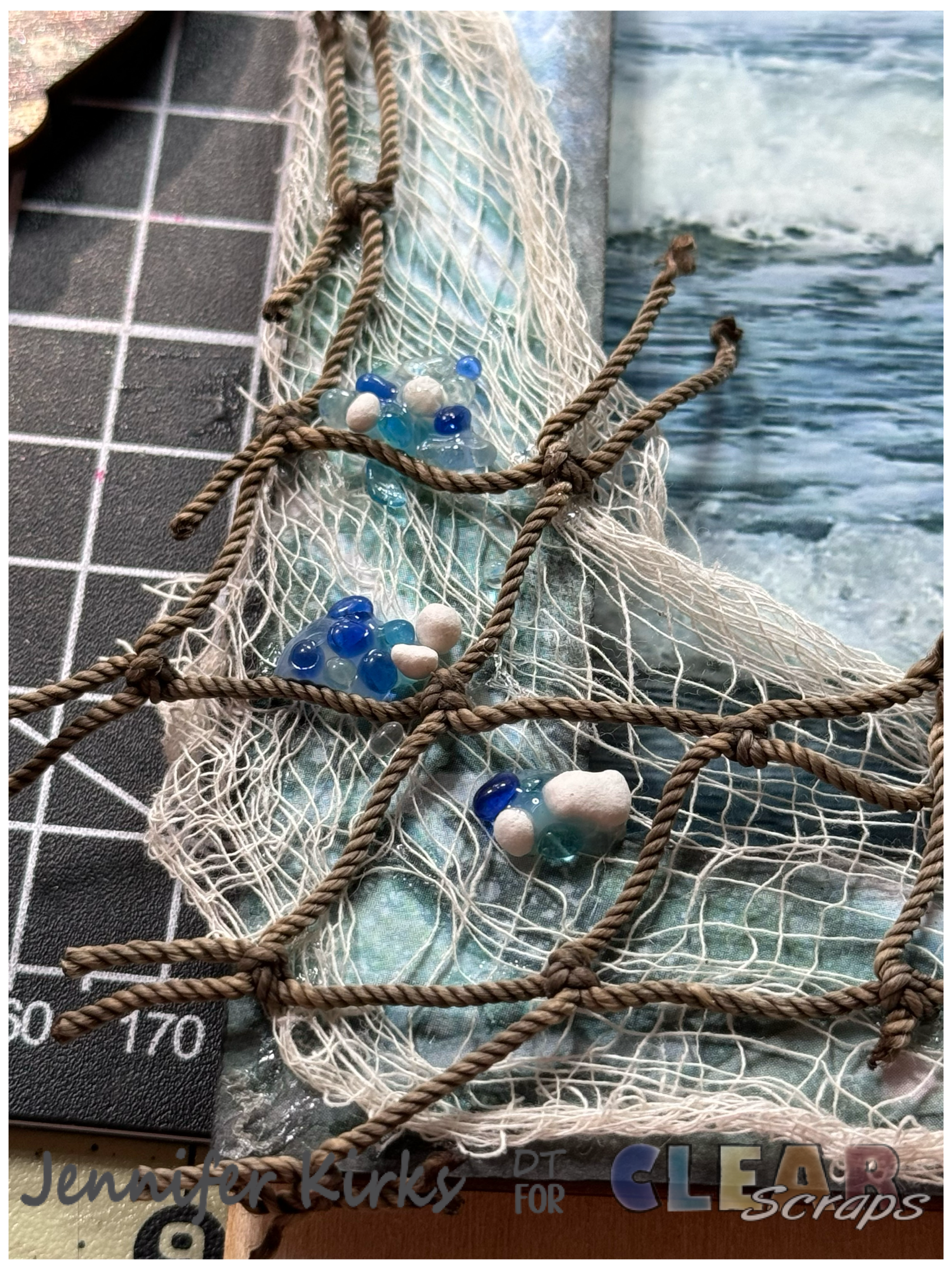 For a charming touch, I adorned the frame by cutting two small pieces of cheesecloth and fishing net, carefully gluing them onto the front of the square frame. Then, I added flair by embellishing with art stones, Mudd Puddles sea glass and some delightful starfish.