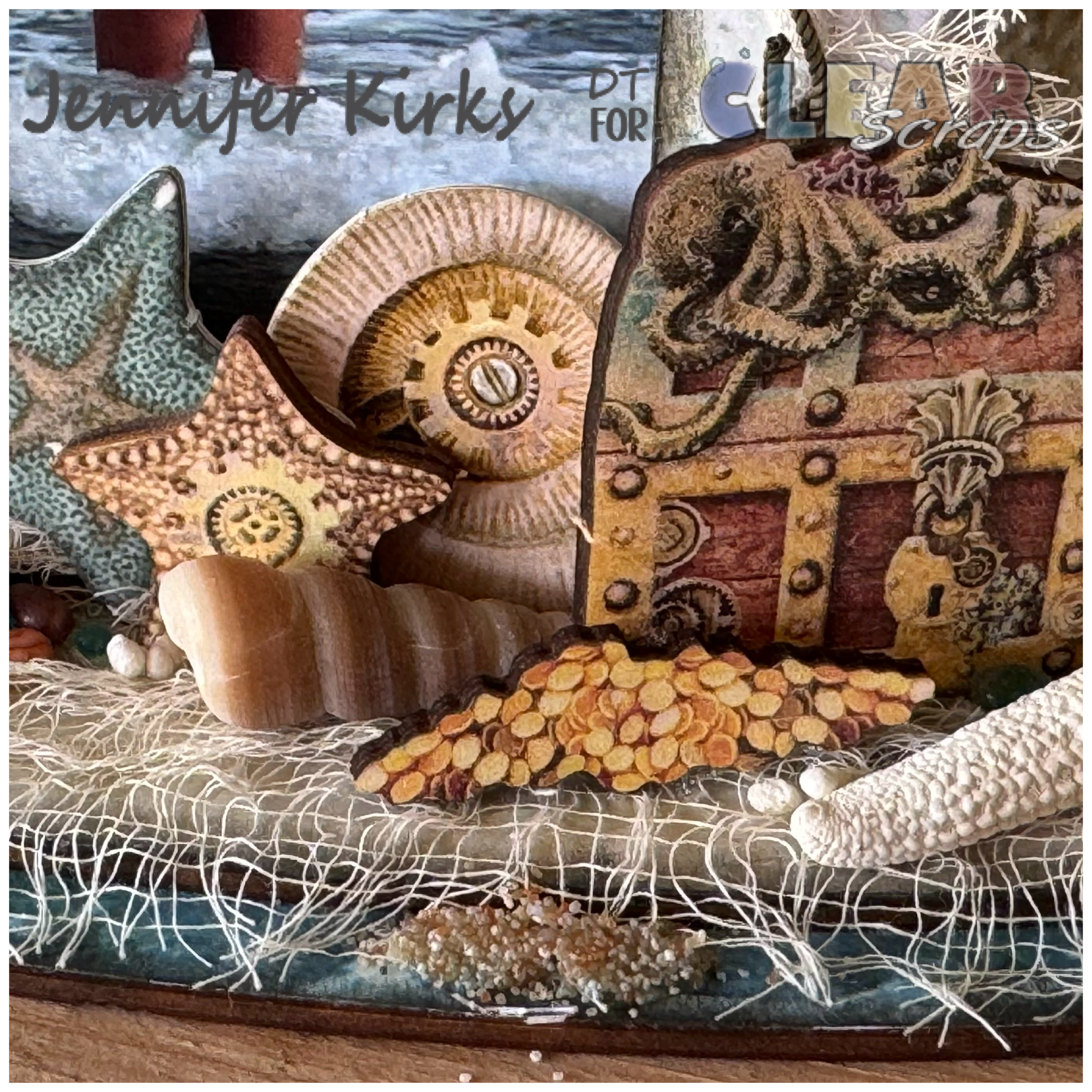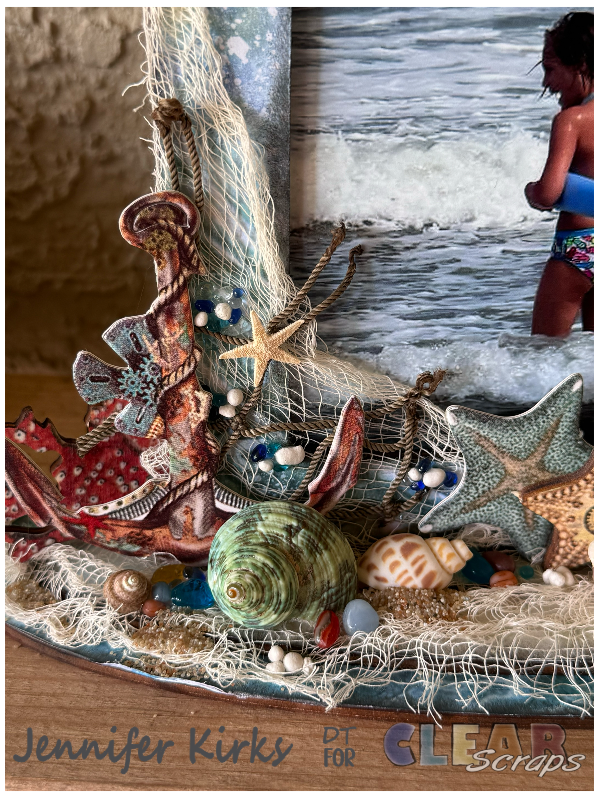 For the base, I securely glued the two pieces together and adorned the front with cheesecloth. Then, I affixed a starfish to the right and inserted the square frame into the middle slot. With precision, I adorned the entire ensemble with various embellishments from the "Song of the Seas" collection. To enhance the coastal vibe, I sprinkled some shells, sea glass, and sand, culminating in a delightful finish and coastal charm.