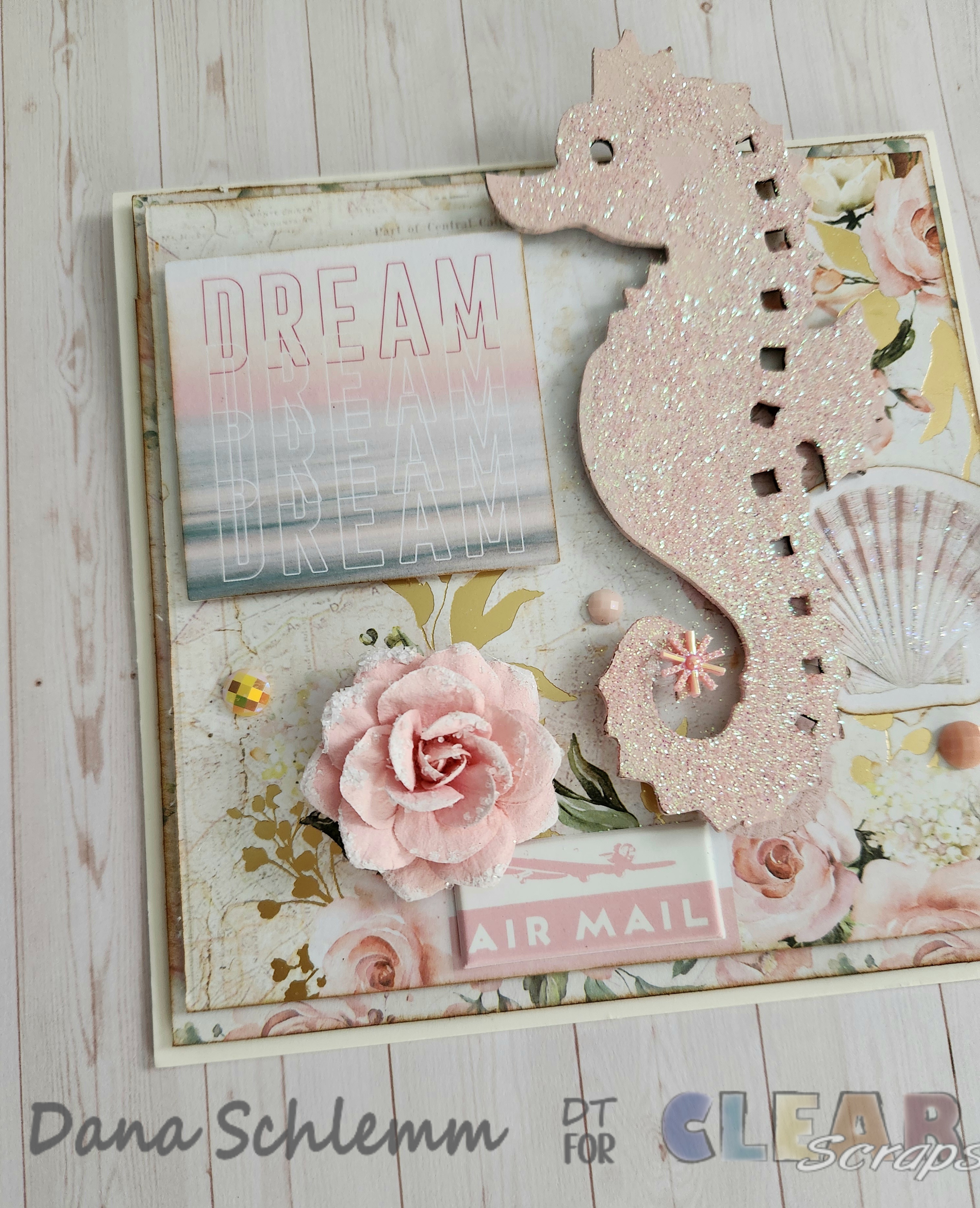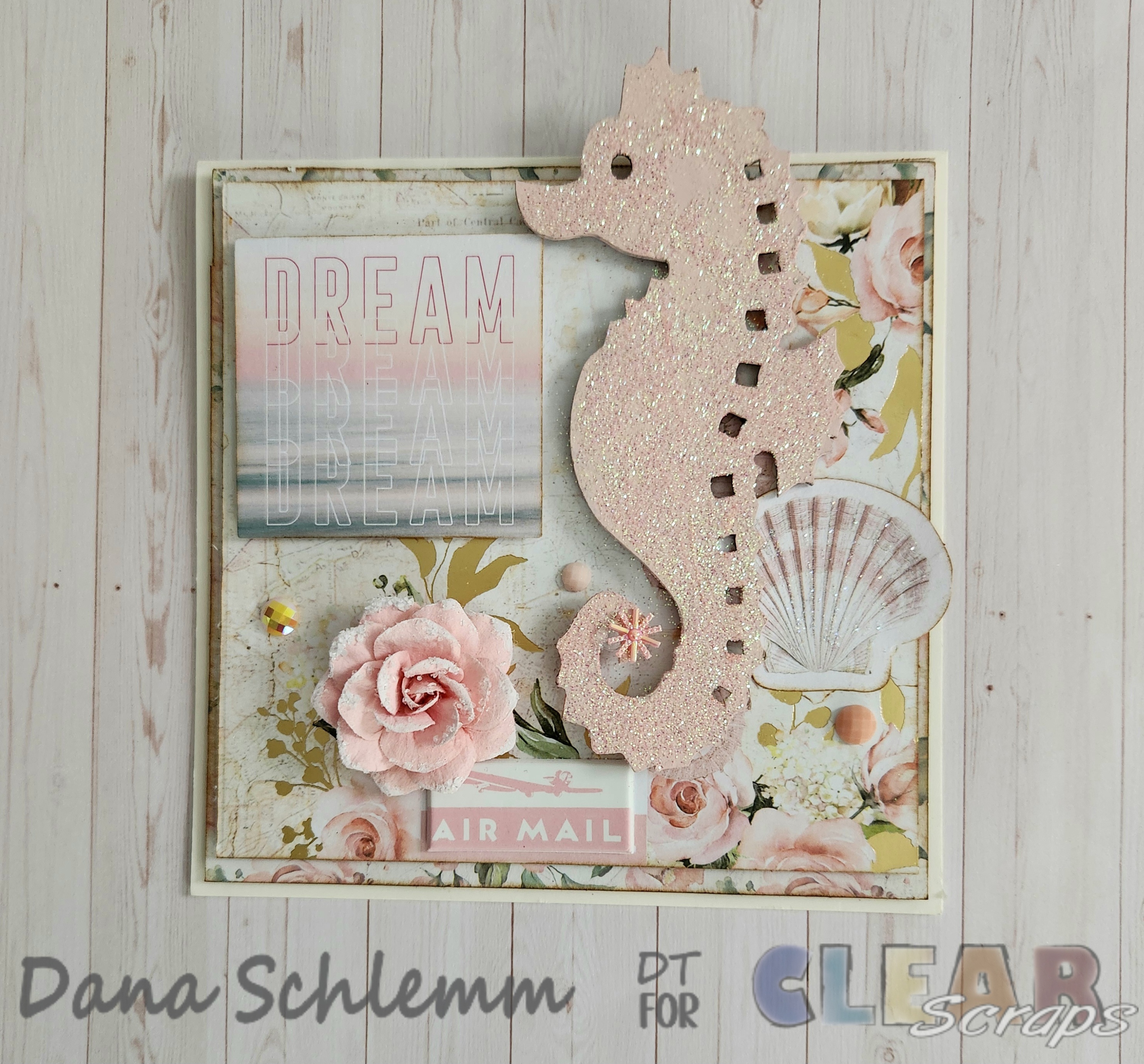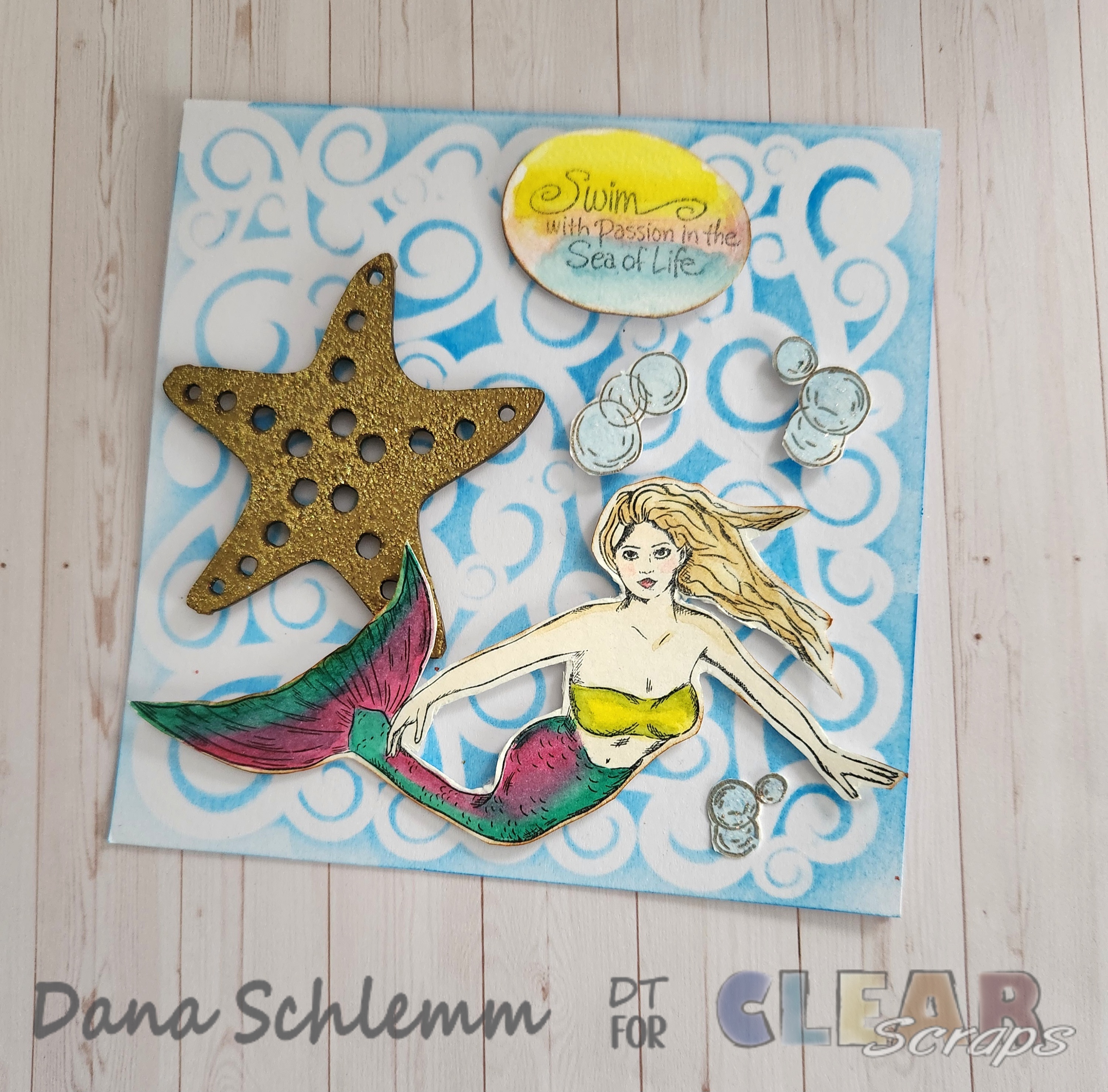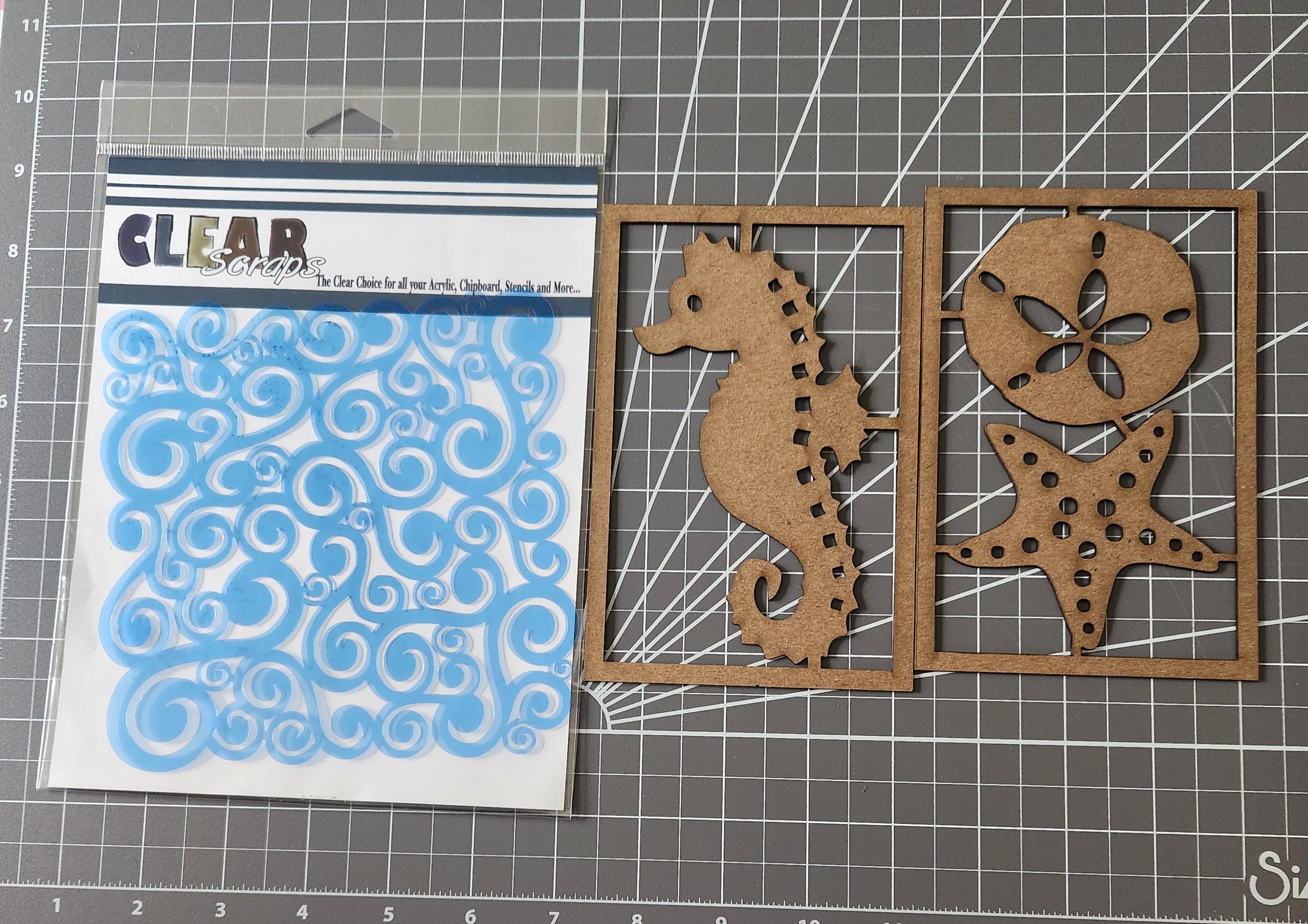My name is Dana. Happy June! I love Summertime and spending time at the beach. This is the theme for my project today. I will be creating 3 different styles of cards, using Clear Scraps 6" Swirl Stencil Click here along with these fun Clear Scraps Sanddollar/Starfish Click here and Seahorse Chipboard Embellishments! Click here