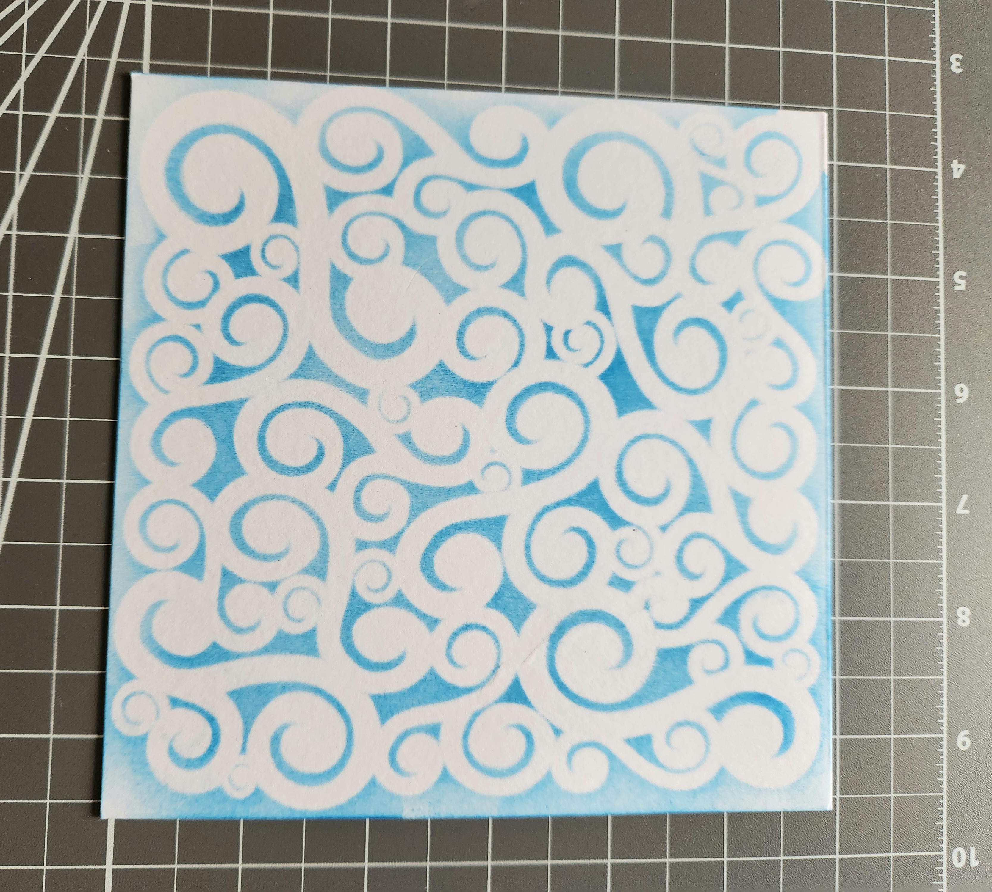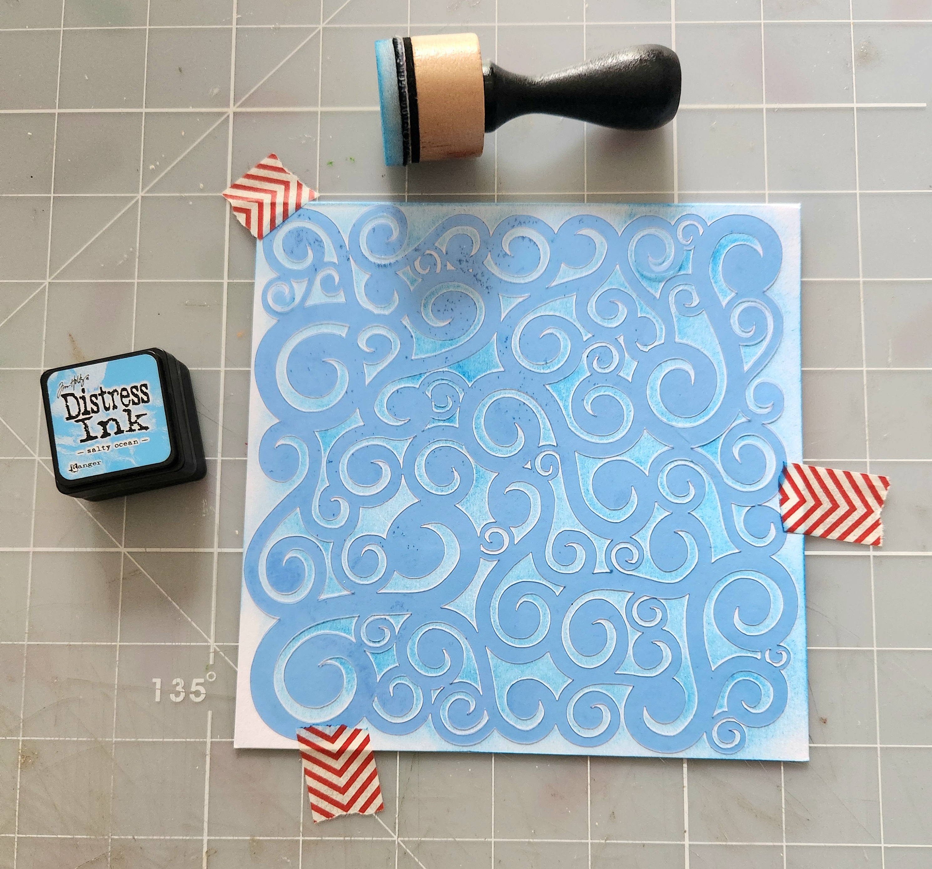 To begin this project, I'll be using a 6×6 inch white card base. Taking my Clear Scraps 6" Swirl stencil, I taped my stencil down securely onto my card front. Using an ink dabber and Tim Holtz Distress Ink-Salty Ocean, I applied my Ink over the top of my stencil using a Swirl motion. See photo: